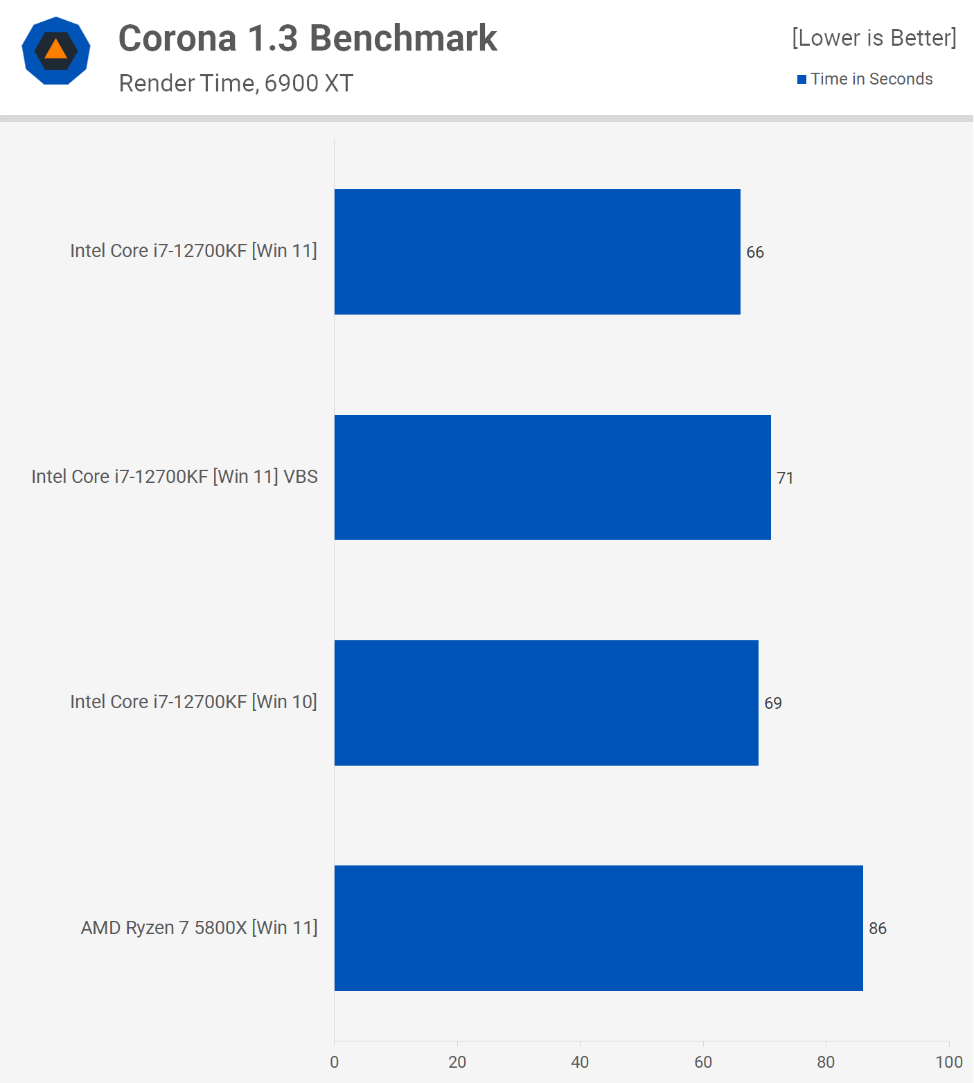 We're looking at a similar thing with the Corona benchmark, though overall Windows 11 without VBS enabled produced the best result, beating Windows 10 by a 5% margin. This time enabling VBS reduced performance by 8%, which is getting up there and becoming noticeable.