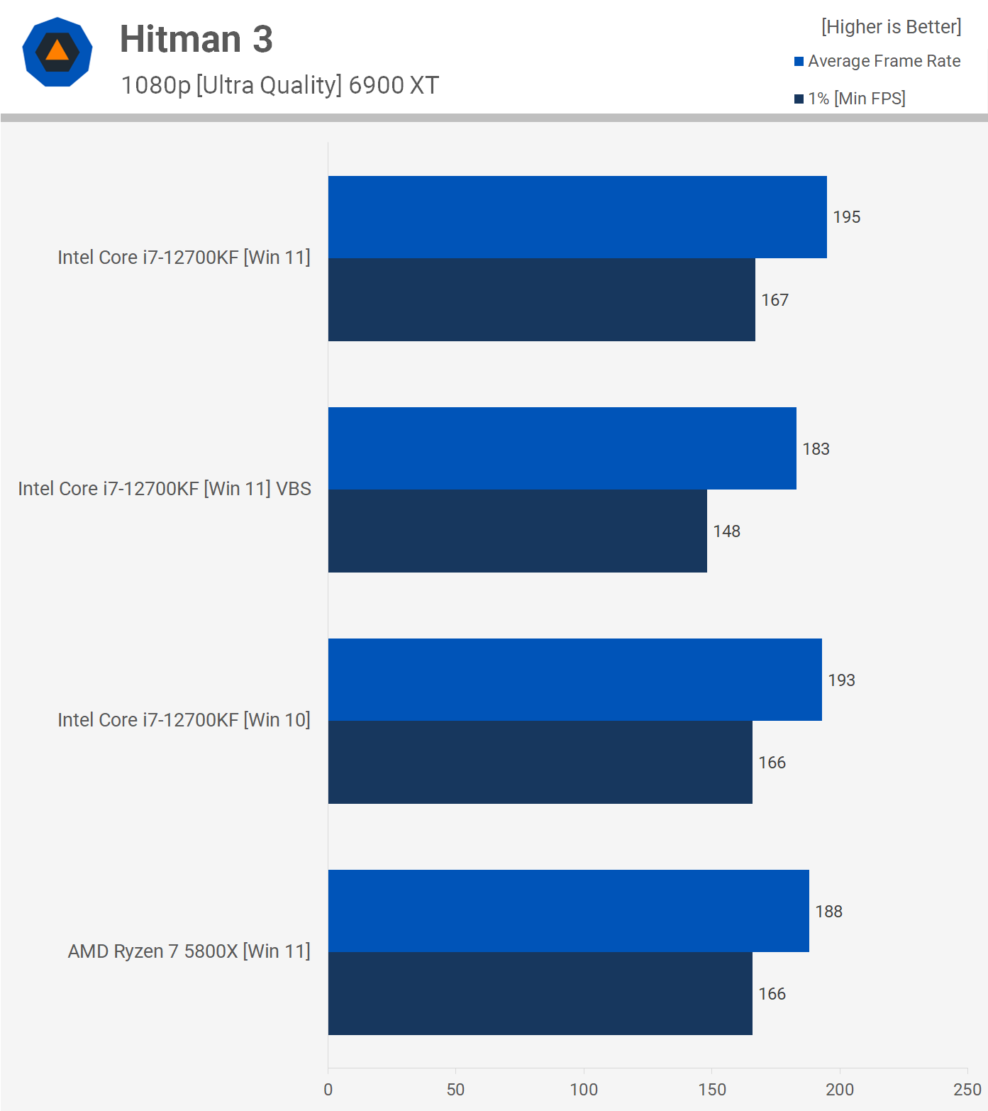 Performance in Hitman 3 was much the same between Windows 10 and 11, but with VBS enabled we're looking at up to an 11% frame rate reduction, seen when looking at the 1% low.