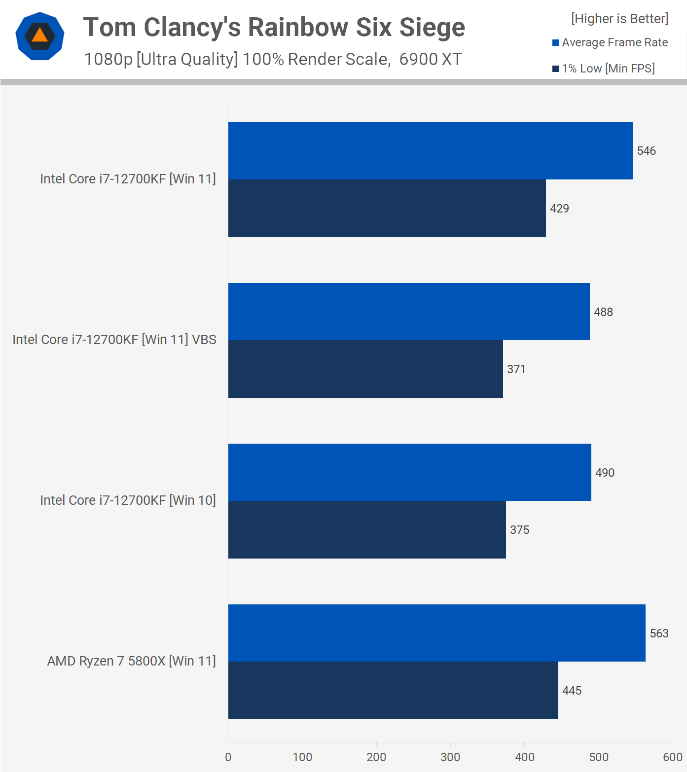Tom Clancy's Rainbow Six Siege results using the Vulkan API are interesting. Windows 11 is up to 14% faster than Windows 10. We saw a 5% uplift for Ryzen, but 14% with the 12700KF is massive. It's also interesting to note that with VBS enabled, Windows 10 and Windows 11 delivered virtually the same level of performance.
