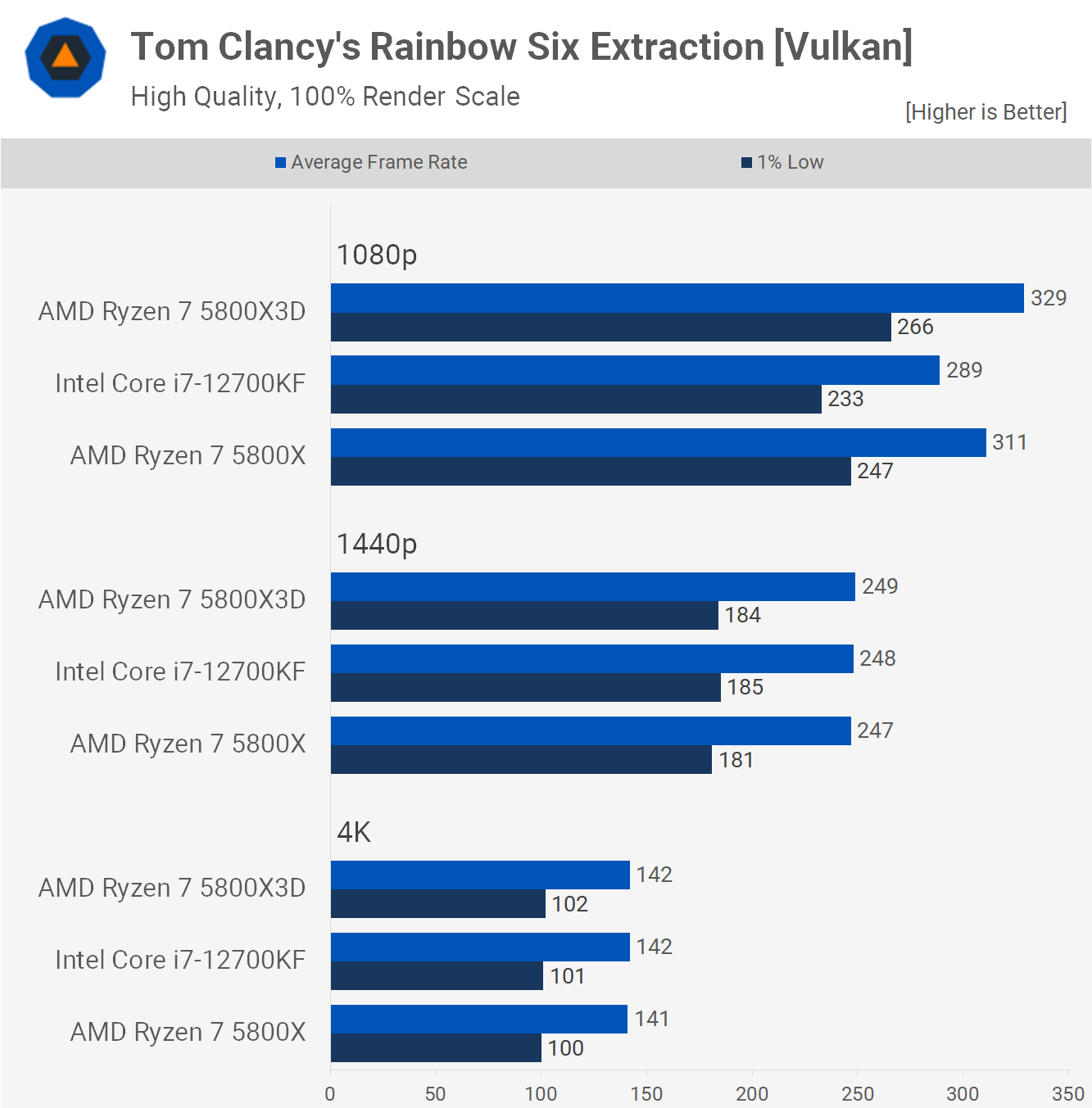 The 5800X and 12700KF are neck and neck in Rainbow Six Siege, with both just shy of 530 fps on average at 1080p, making the 5800X3D up to 13% faster at this resolution. By the time we hit 1440p we're entirely GPU bound with the RTX 3090 Ti, so it's hard to say how useful the performance advantage offered by the V-Cache is.