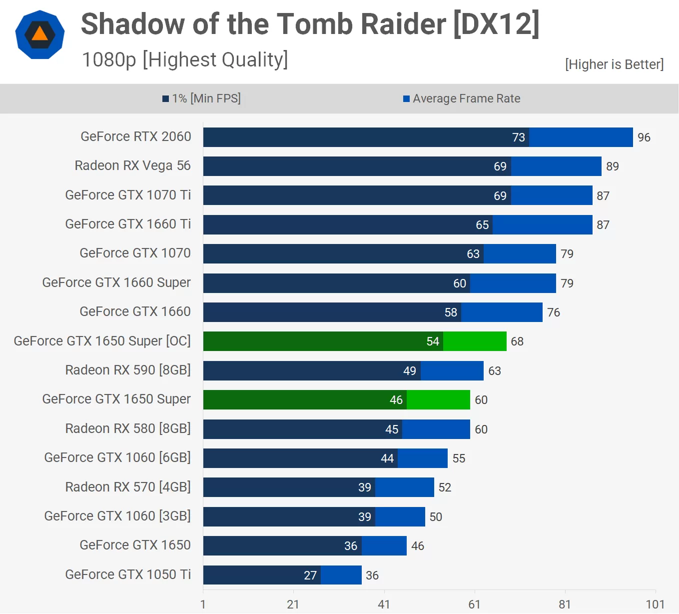 We also see a healthy 13% performance boost in Shadow of the Tomb Raider. Here the overclocked 1650 Super spat out 68 fps on average, making it 11% slower than the stock GTX 1660.