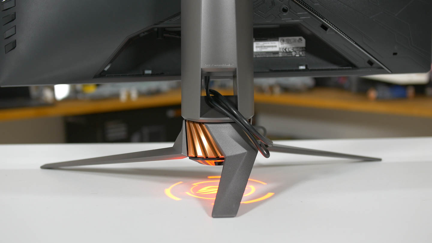 Yes, we're getting all the usual Asus gamer style garbage-like RGB LEDs on the back, projected light under the stand, plenty of interesting patterns and design elements, and a typical Asus ROG color scheme.