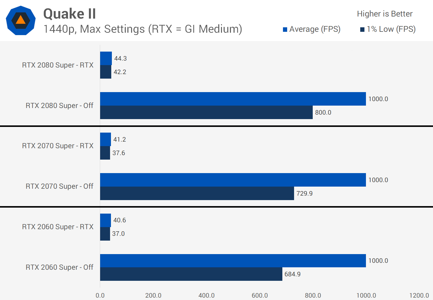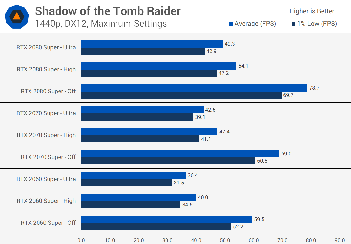 That said, Nvidia's Super cards are marginally faster at ray tracing than the non Super models, roughly in line with the performance increase we see in non ray tracing scenarios. The difference between RTX on and off with non Super cards is also similar, which makes sense since Nvidia didn't enable a proportionally higher amount of RT cores with the Super cards.