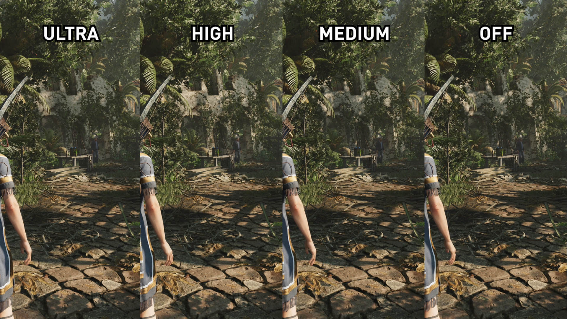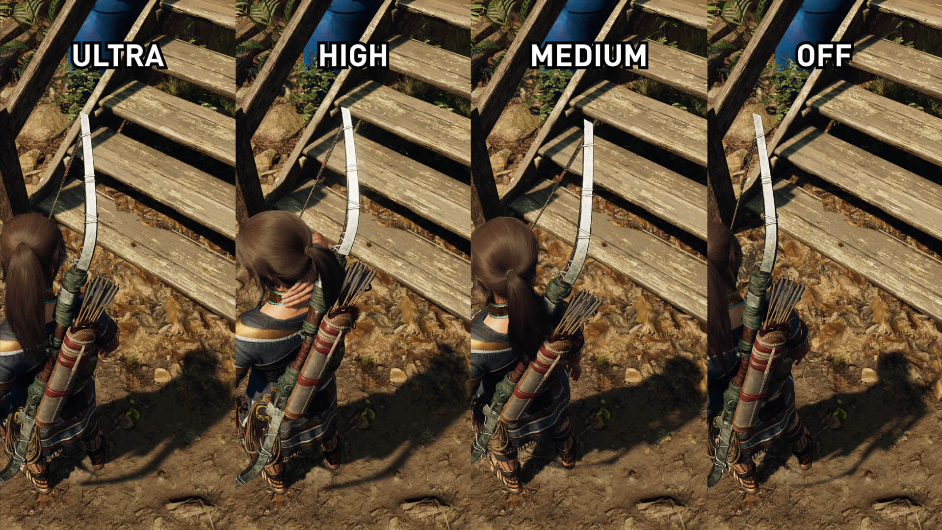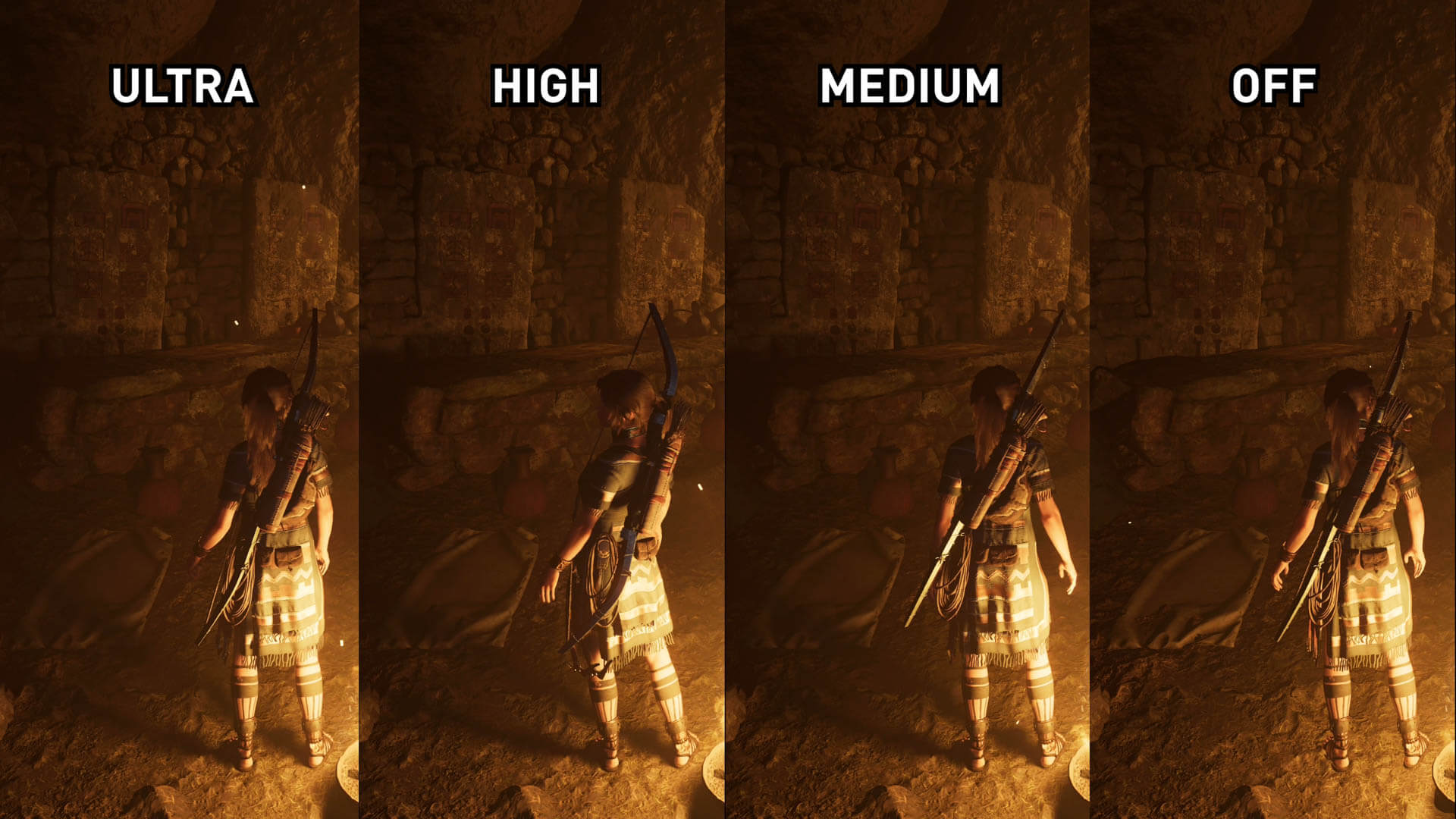 Shadow of the Tomb Raider uses ray tracing for shadows, unlike other games which so far have mostly stuck to reflections or global illumination. Ray tracing shadows allows for a more accurate representation of lighting in the game, with better distance-based shadow softening as you'd see in real life, as well as better point light shadows.