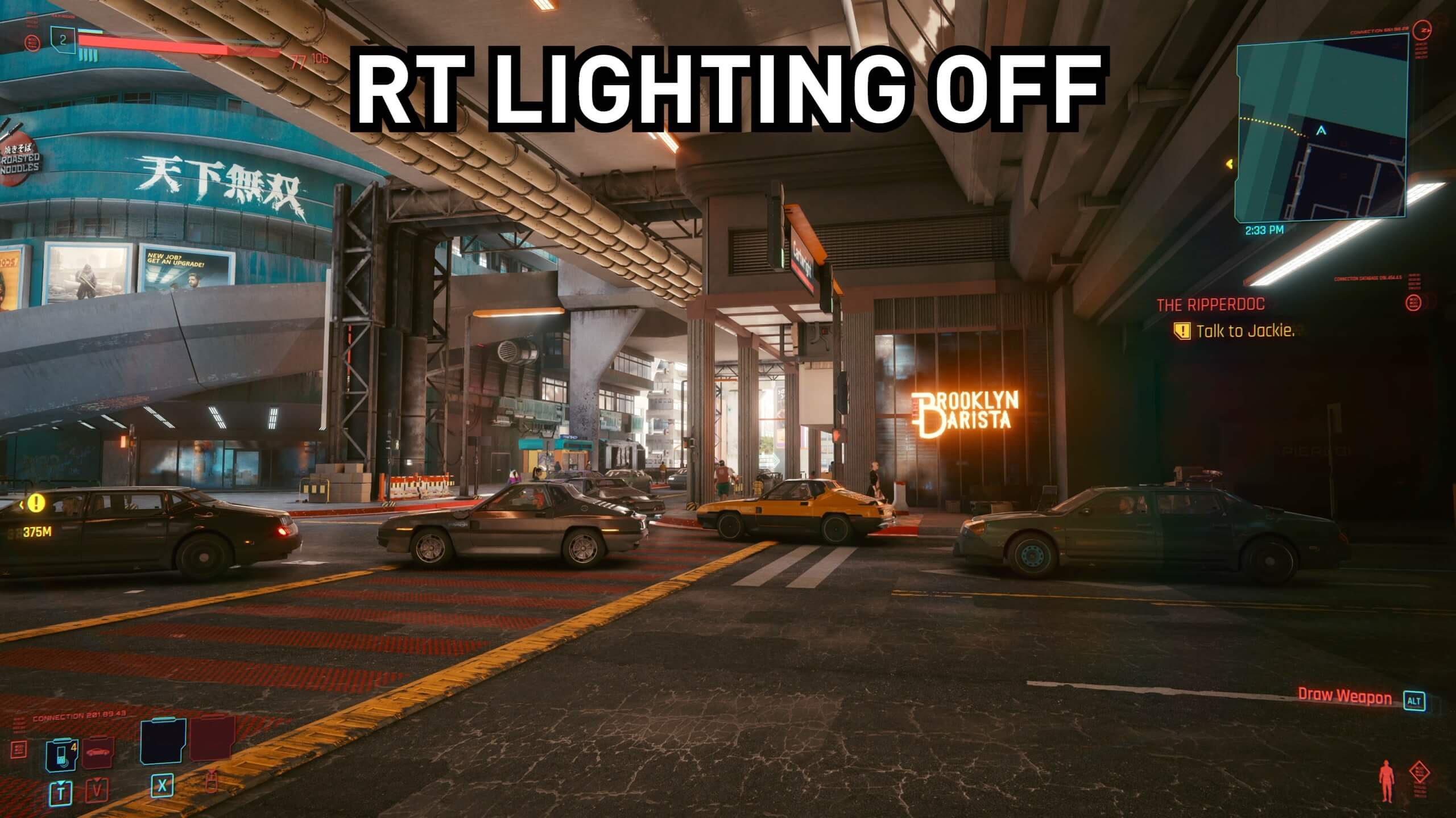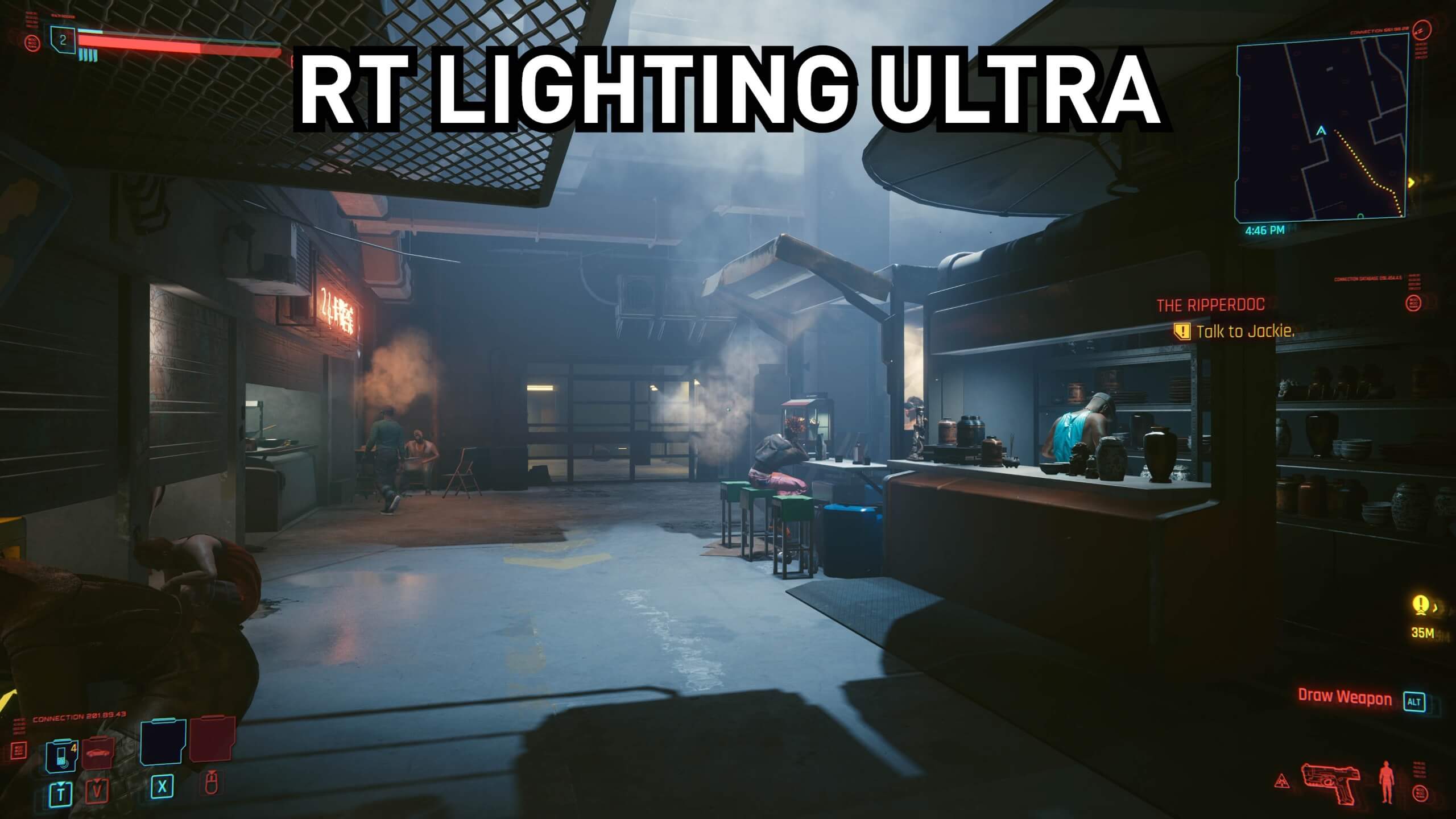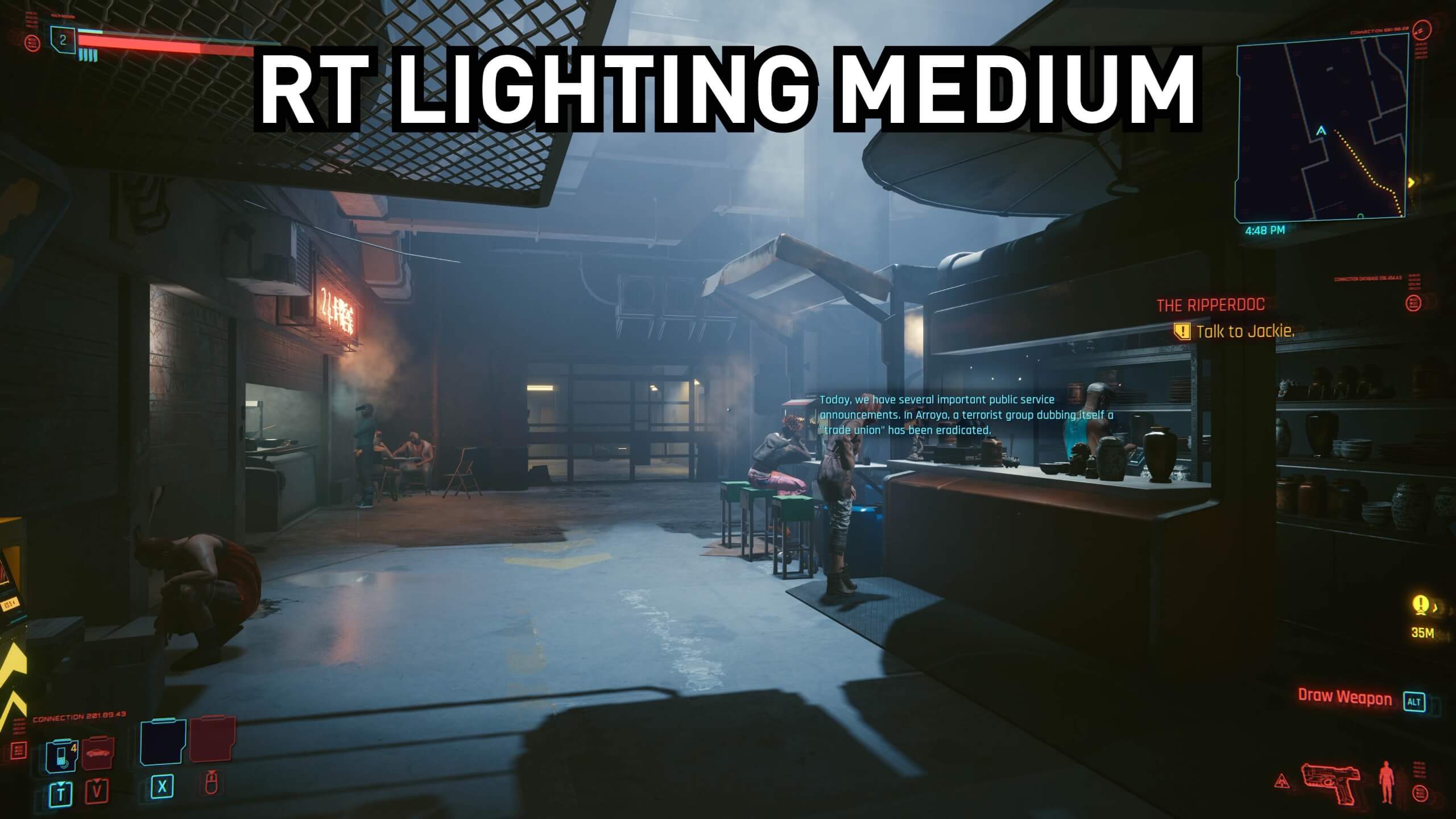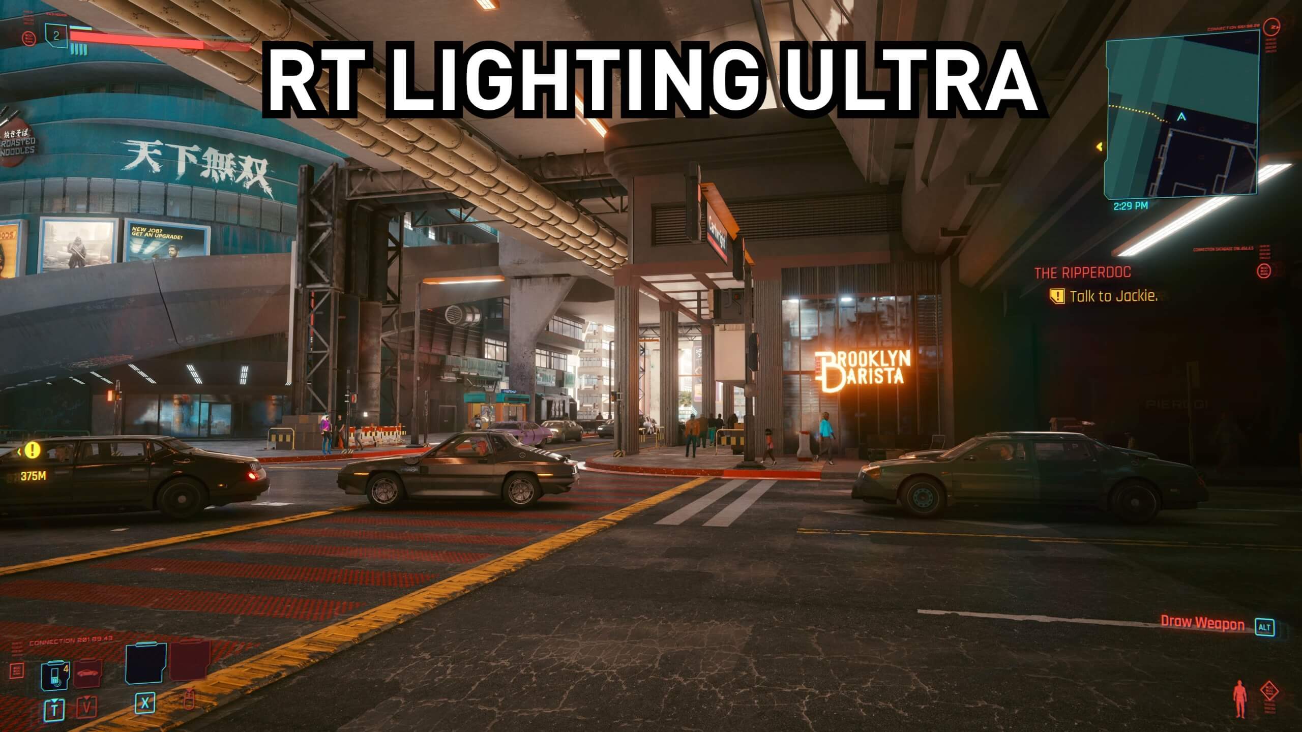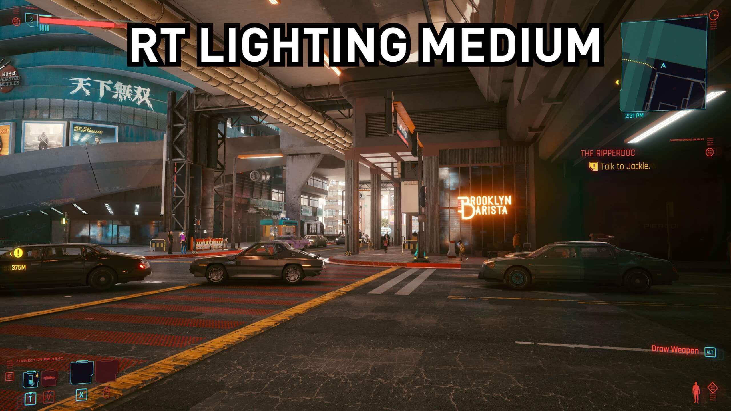 Cyberpunk has ray tracing support split into three settings: ray traced reflections, ray traced shadows, and ray traced lighting, the latter of which has three different modes.