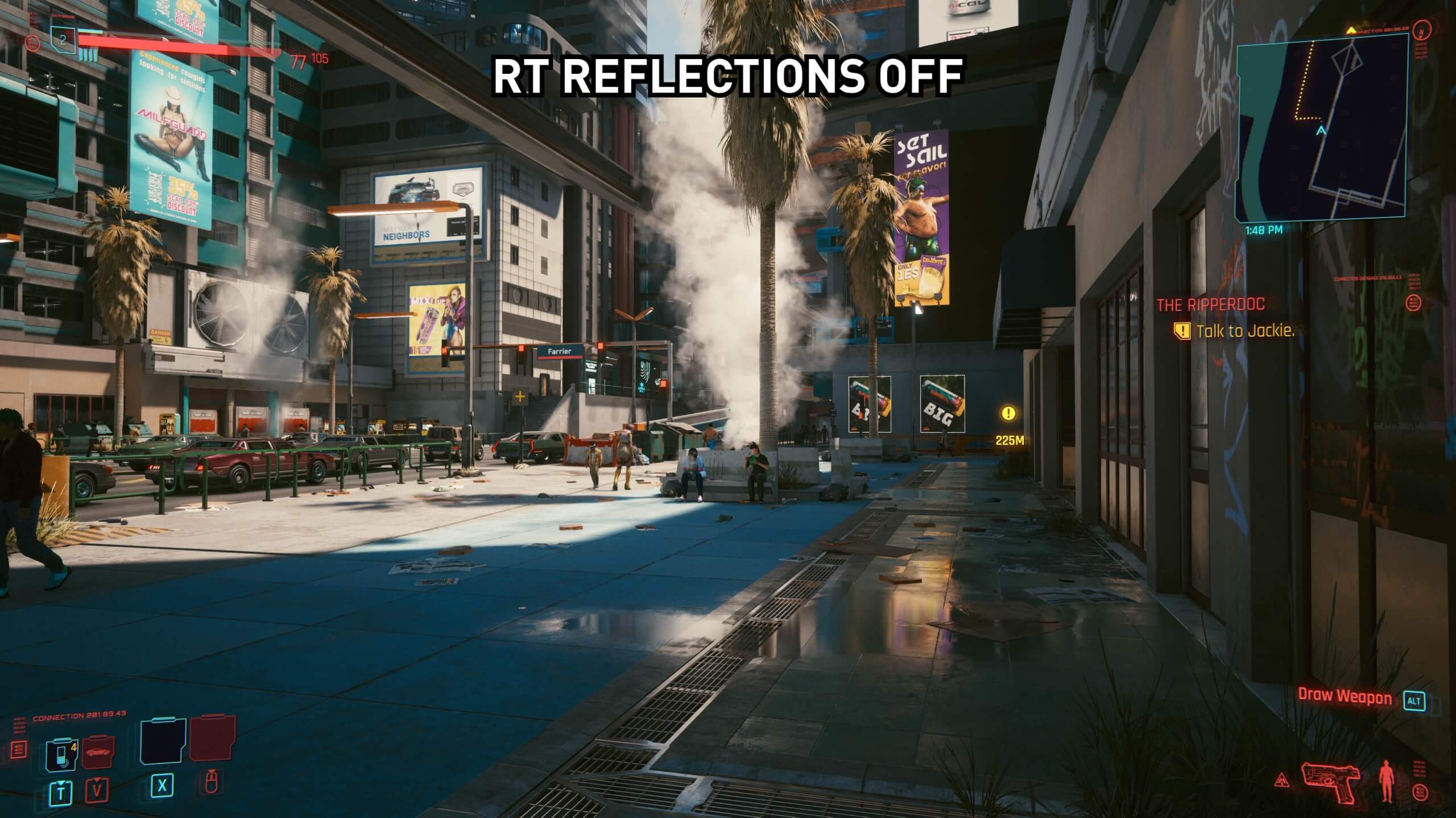 Reflections is arguably the biggest setting in the game, providing the most substantial visual upgrade over standard rasterization. What's most impressive about the way Cyberpunk handles ray traced reflections is how many surfaces reflections get applied to. It's not just the regular glass and puddles of water, but a whole range of surfaces that include more matte elements and metals. While many of these surfaces still receive screen space reflections to some extent and look good without ray tracing, turning on ray traced reflections delivers a next level experience that enhances the overall visual quality.