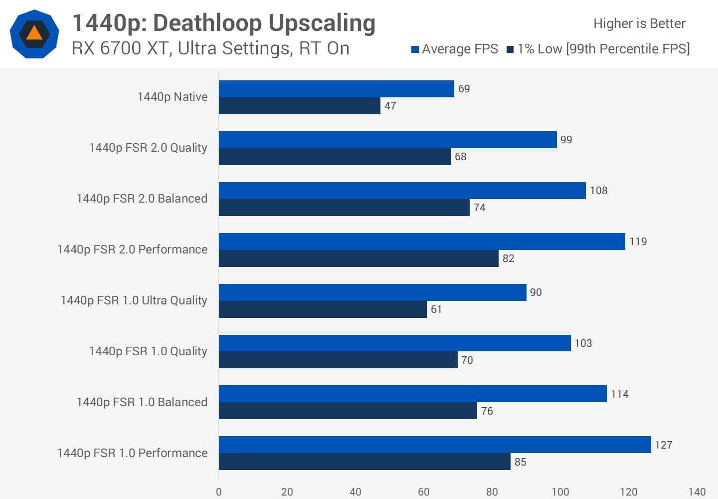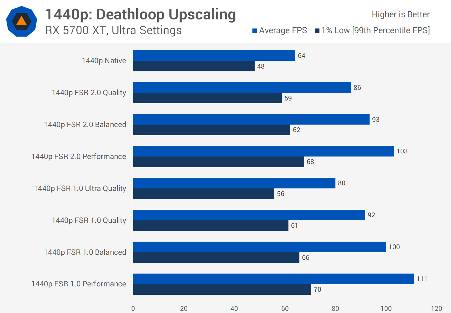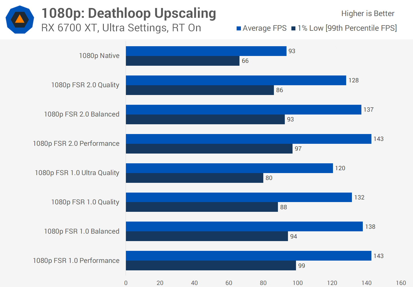 The FSR 2.0 Quality mode was only 6 percent faster than native, and the Performance mode barely improved up on that. In comparison, FSR 1.0 was able to deliver much better frame rates, with the Quality mode there delivering higher FPS than FSR 2.0 Performance.