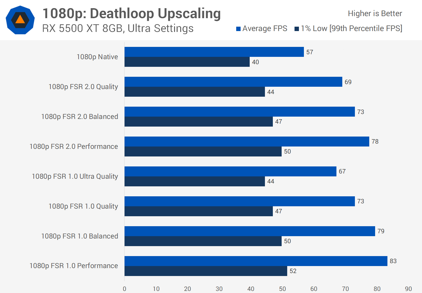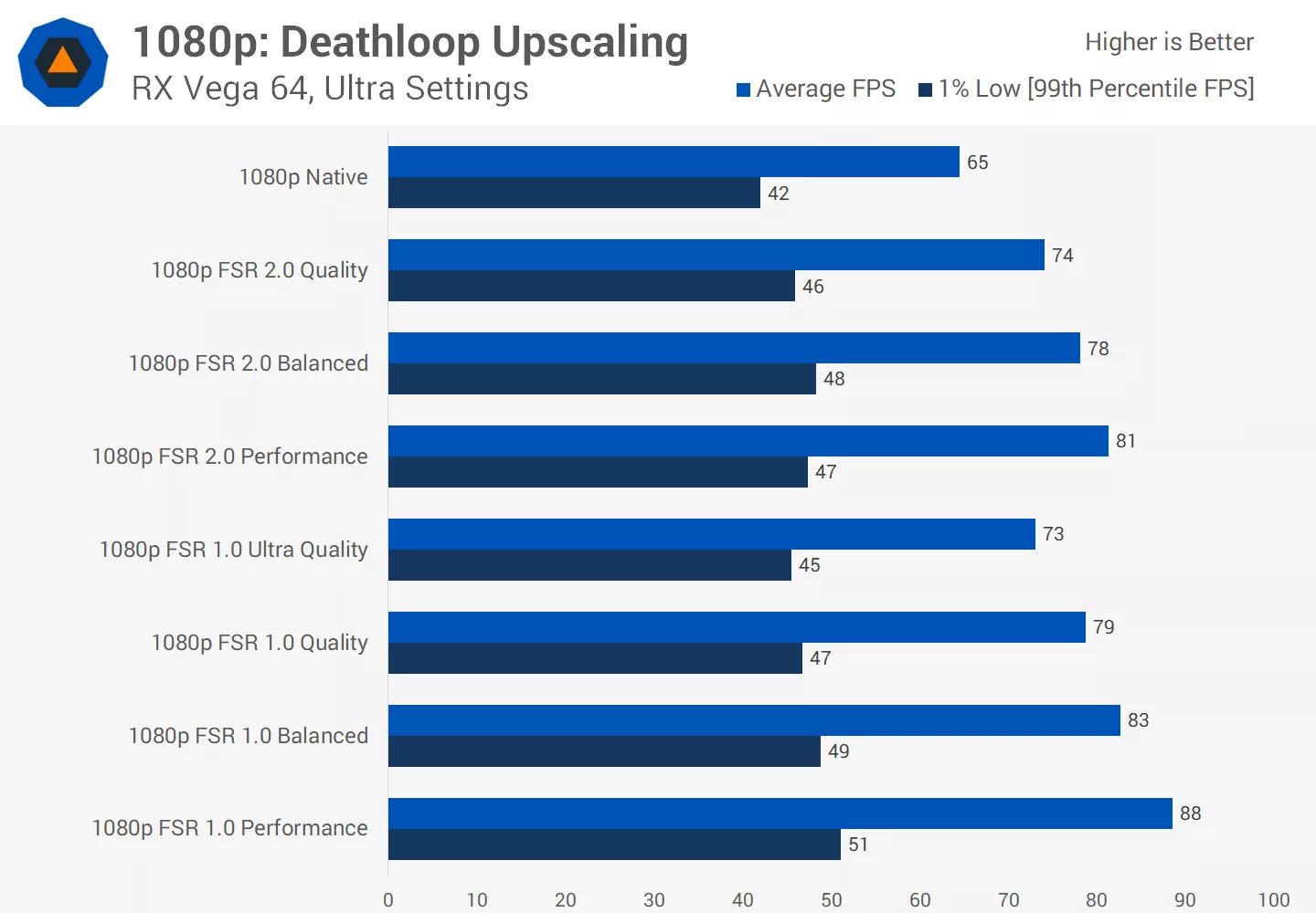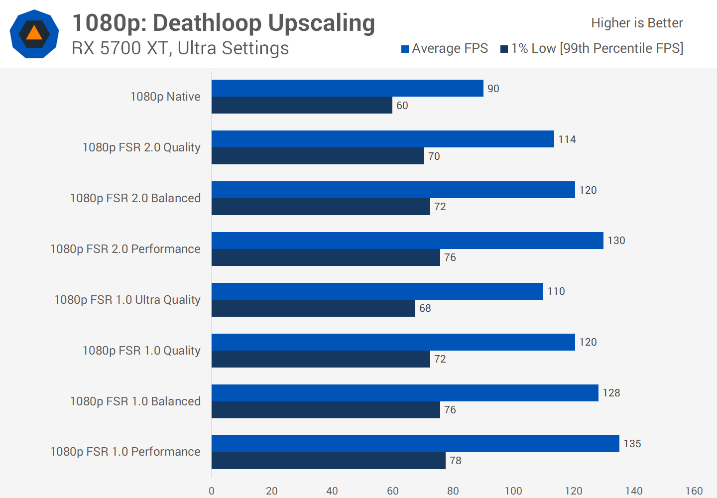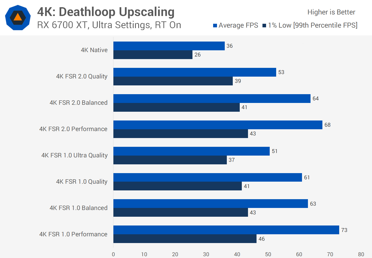 The FSR 2.0 Quality mode was only 6 percent faster than native, and the Performance mode barely improved up on that. In comparison, FSR 1.0 was able to deliver much better frame rates, with the Quality mode there delivering higher FPS than FSR 2.0 Performance.
