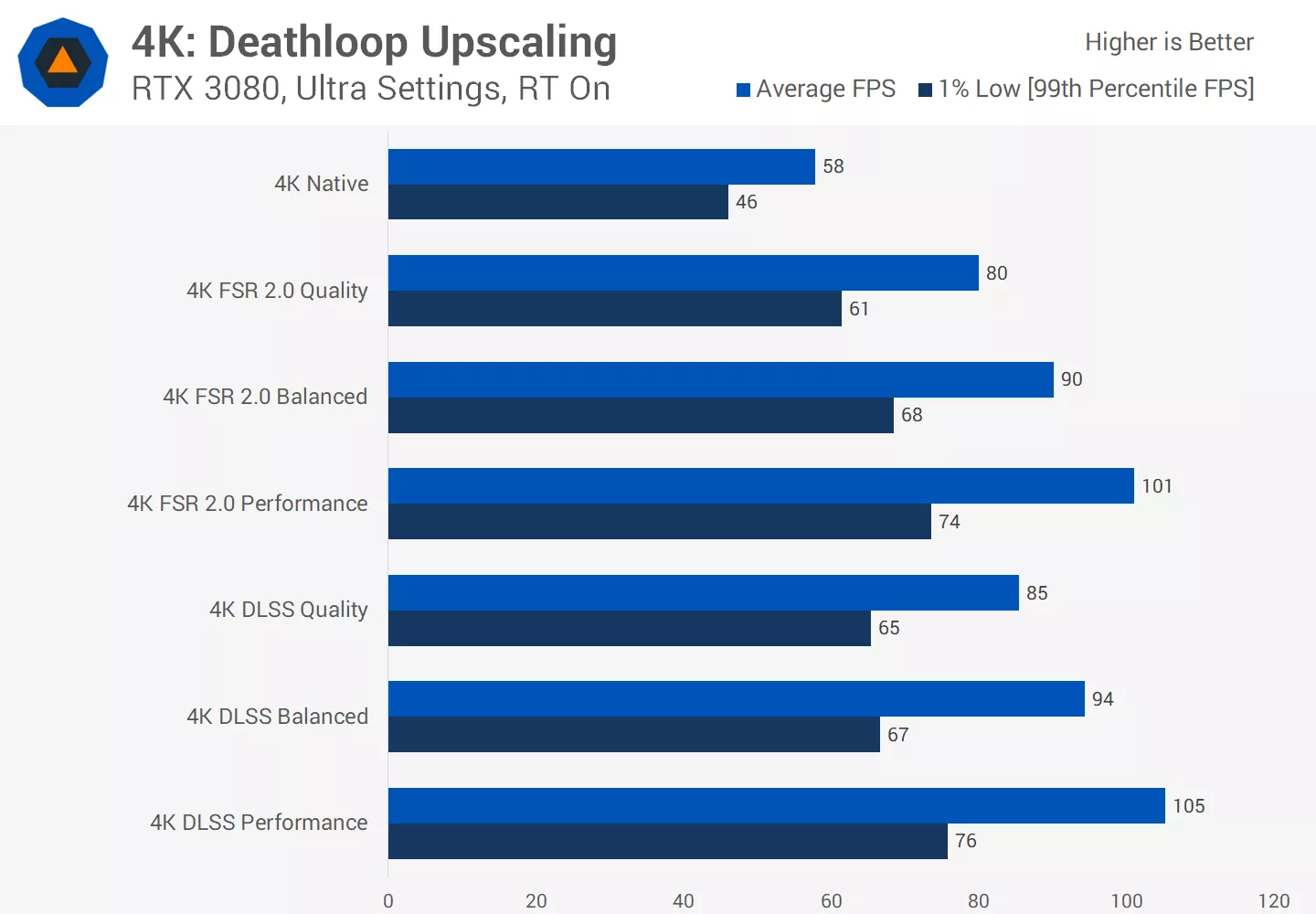 Then for the RTX 3080 using the same settings at 4K, we see a larger gain of 38 percent for FSR 2.0 Quality vs native, and 74 percent for the Performance mode. However like with other Nvidia GPUs that we've benchmarked, DLSS is the faster option, delivering 4 to 6 percent higher frame rates at the equivalent quality settings to FSR 2.0. So my general thoughts on using DLSS over FSR 2.0 on Nvidia's latest GPUs holds true.