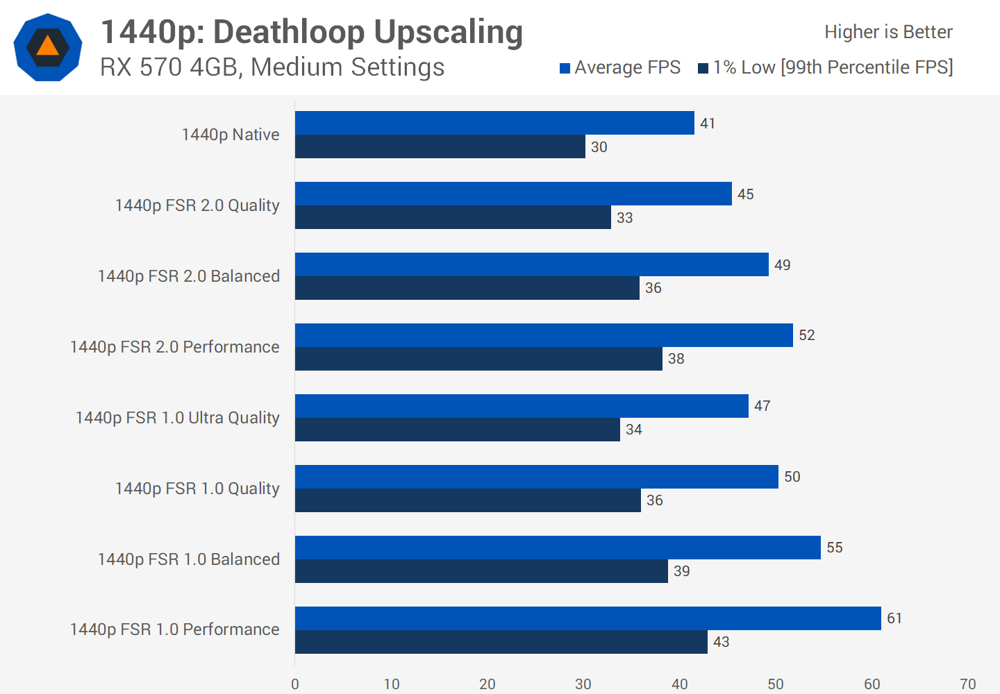 It's still worth using, but not the instant 40%+ gains we saw from the latest architectures. You can also see that FSR 1.0 is indeed faster, which wasn't the case with RDNA2 either. With the 6700 XT, typically FSR 2.0 Quality mode ran better than FSR 1.0 Ultra Quality. But with the RX 570, it's the less taxing FSR 1.0 that runs a few frames better. However, I'd still recommend using FSR 2.0 here as the visual quality is significantly superior at 1440p.