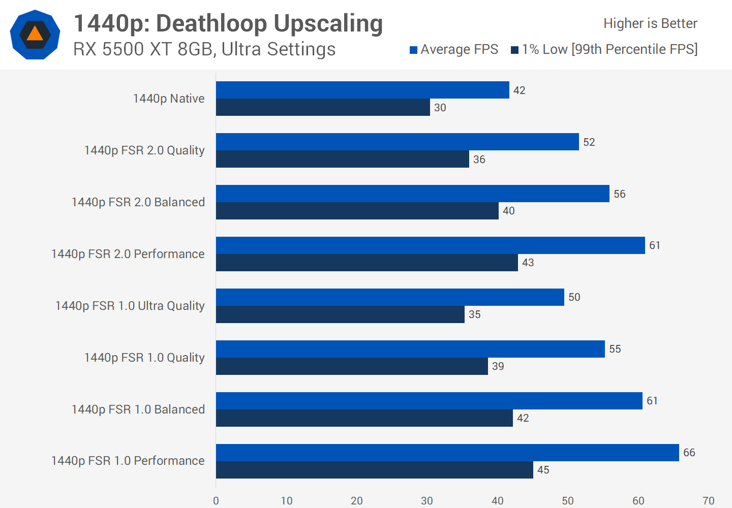 Under the same architecture family, let's now look at the much faster RX 5700 XT. With the same architecture and same memory capacity at hand, FSR 2.0 clearly does benefit from more GPU resources. At 1440p using FSR 2.0 Quality mode, we saw a 34 percent performance uplift, higher than the 24% we saw for the 5500 XT. A larger uplift was also possible for the Performance mode, 61 percent here compared to 45% for entry-level RDNA.