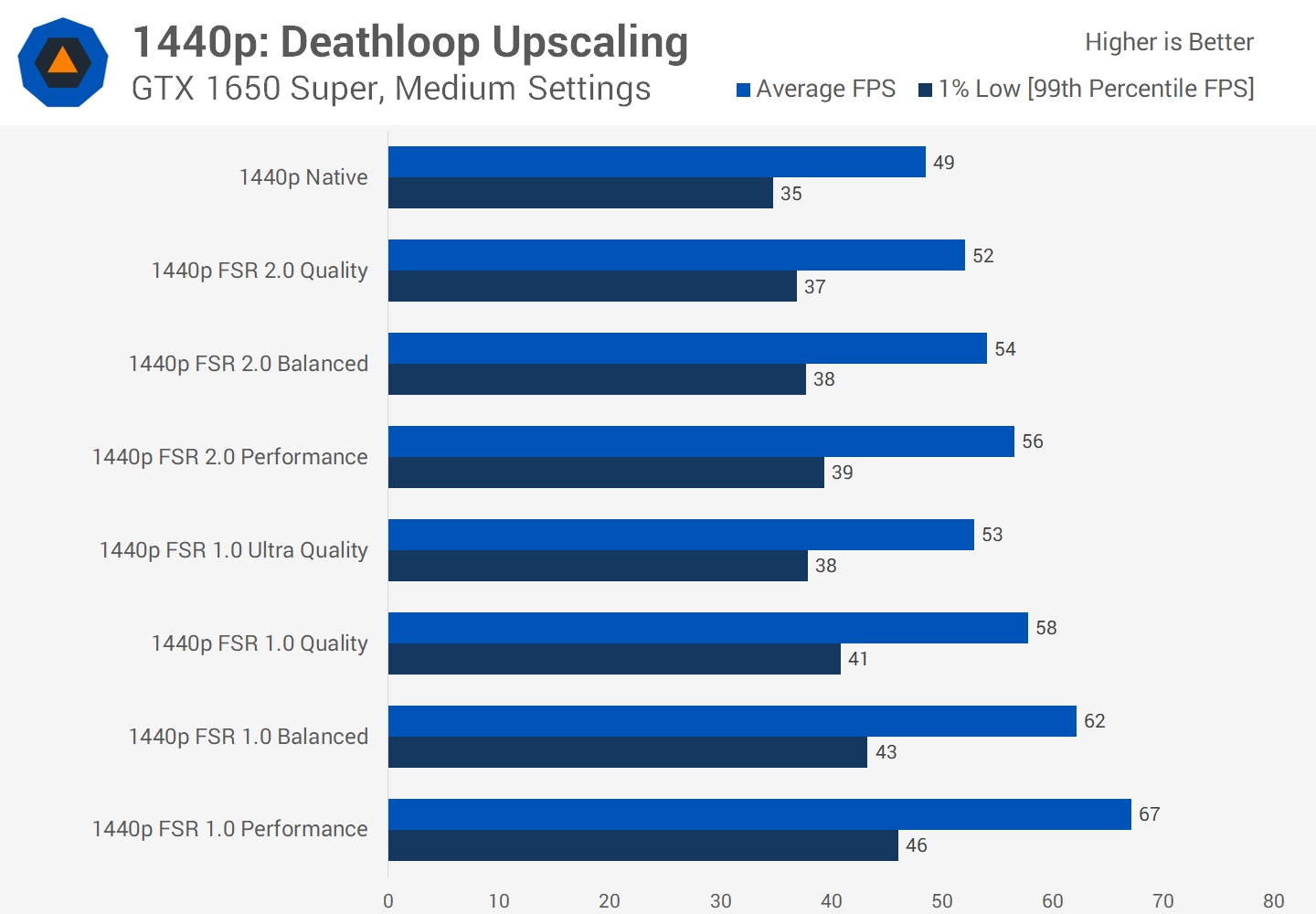 The GeForce GTX 1650 Super is also an entry-level GPU but it's a fair bit newer but doesn't support DLSS as it lacks tensor cores. Like the RX 570, the GTX 1650 Super doesn't benefit hugely at 1440p with either FSR 2.0 or 1.0 in this title, and it seems that even Medium settings is a bit of a stretch here.