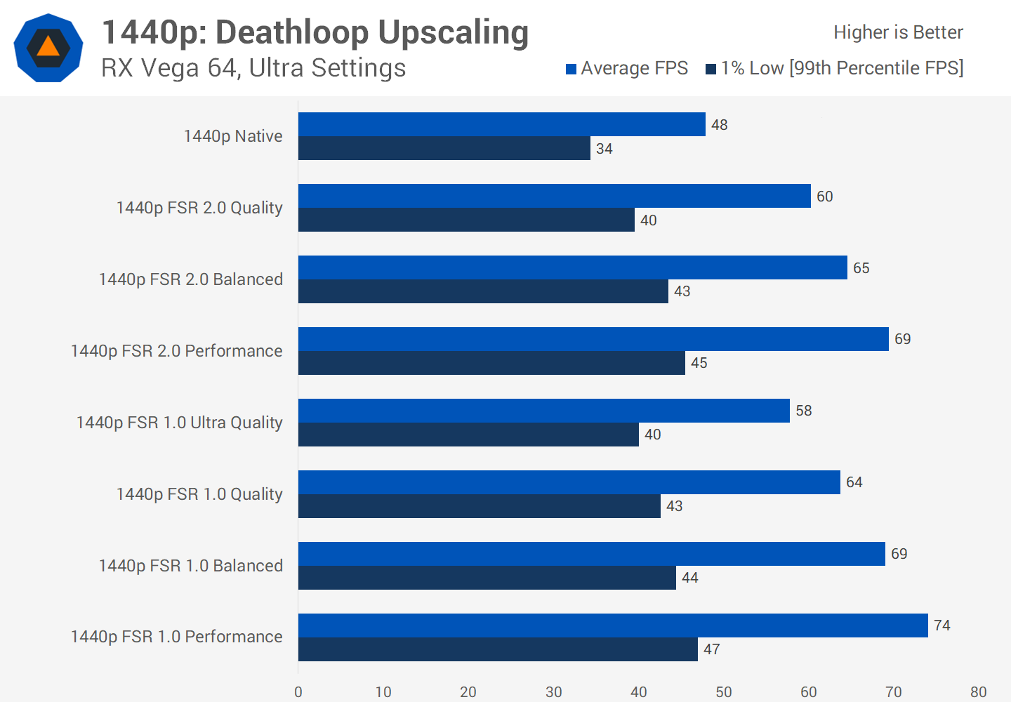 At 1080p, I actually saw less of a gain than at 1440p for FSR 2.0 as it seems like pure shading isn't necessarily the main limiting factor for performance on Vega 64. If shading performance isn't the main bottleneck, then lowering the render resolution may only have limited gains, which seems to be happening here. Other areas to performance, like memory or geometry, could be holding us back from further gains. But either way we still do get a performance uplift.