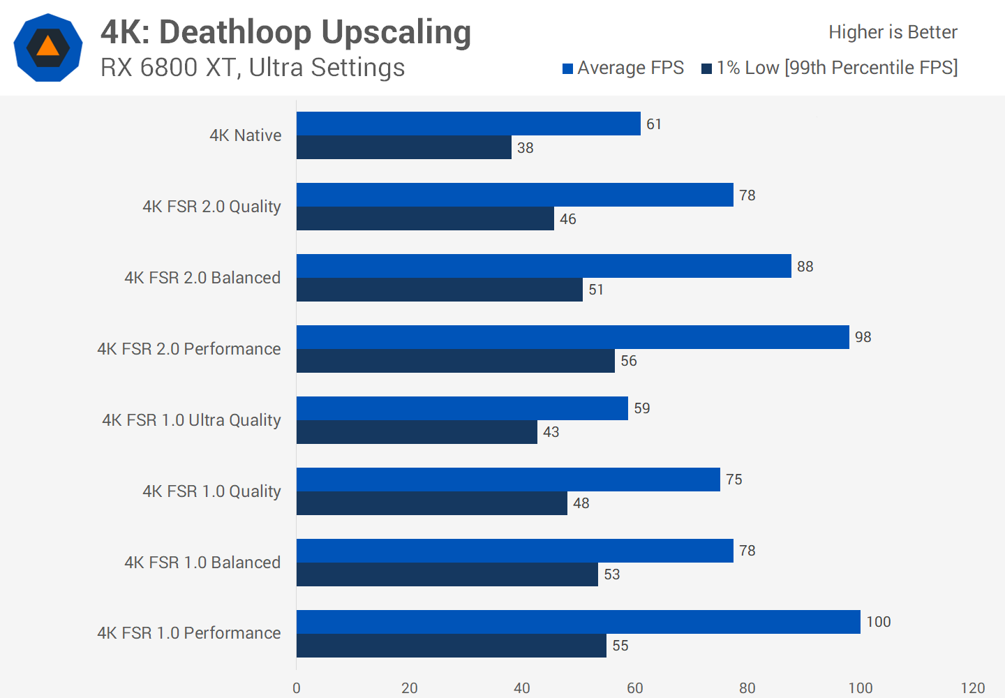 This is because FSR 2.0 has a fixed rendering cost, which takes up a larger proportion of the total frame rendering time at higher frame rates. But even if your baseline is 100 FPS or more, FSR 2.0 can still provide solid gains on newer architectures, provided you don't run into CPU bottlenecks.