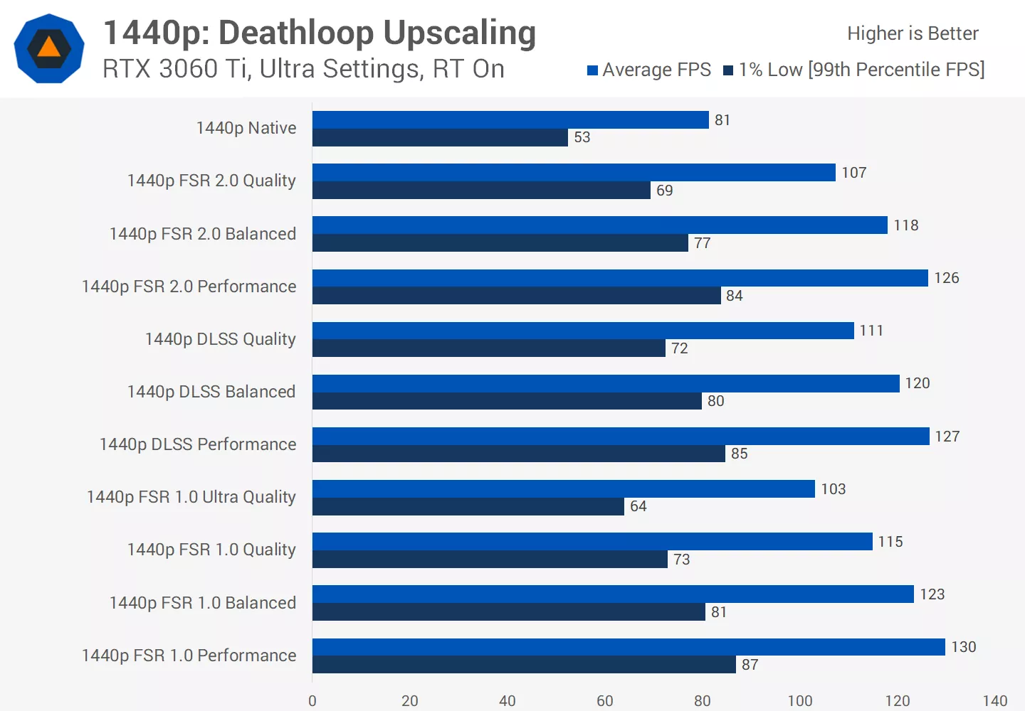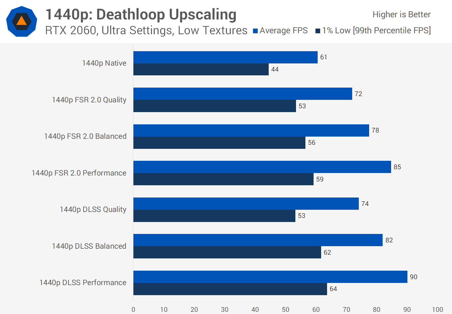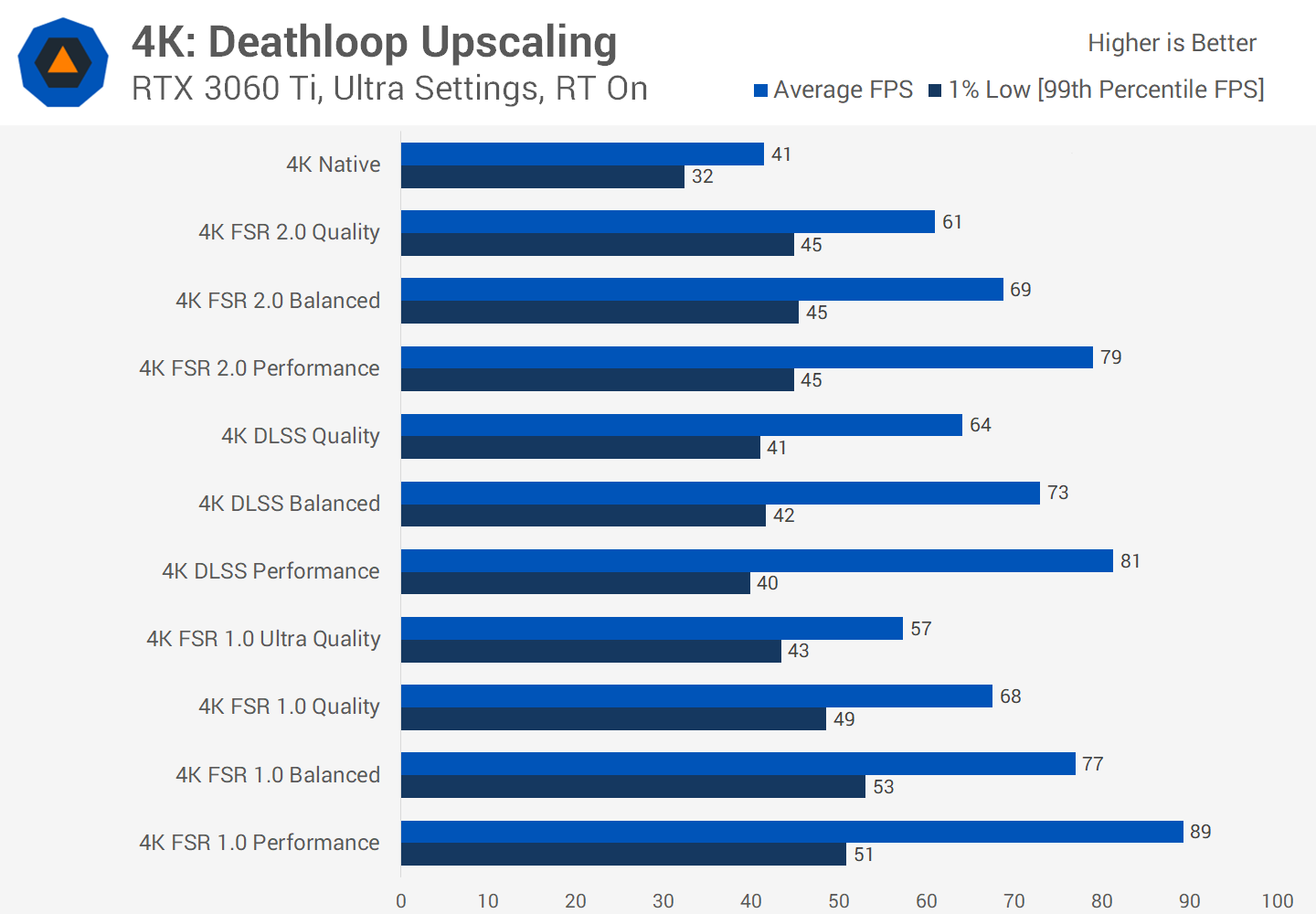 To prevent CPU bottlenecks, we've run Deathloop at the best quality playable settings for each GPU, which includes ray tracing enabled on higher end cards. Deathloop is a demanding game on GPU memory, and some of the cards we've tested have only 4 GB or 6 GB of VRAM, which causes issues on the highest settings and basically bottlenecks the card - meaning we don't see the real benefits of FSR 2.0 or other upscaling algorithms. For those GPUs, we've reduced the settings to an appropriate level that doesn't cause a bottleneck.