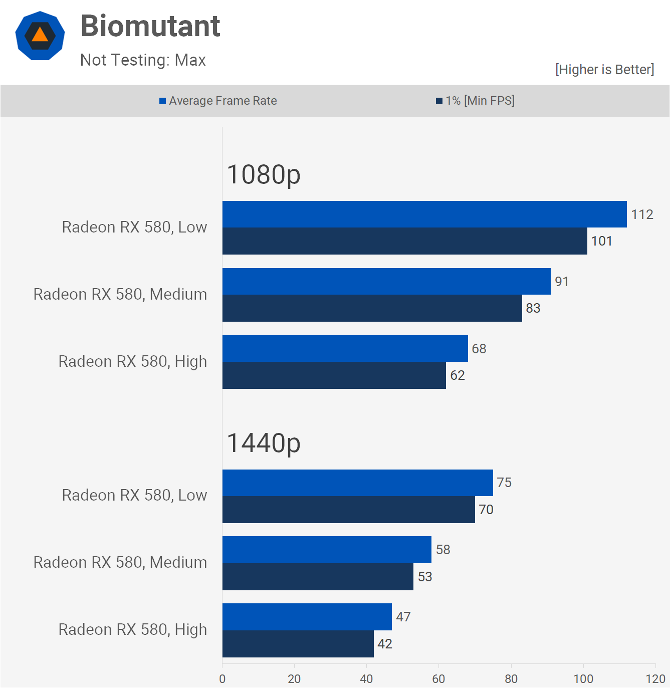 The most recently released game I've used for testing is Biomutant and I was shocked by not just how good this game looked, but also by how well it ran on the RX 580, pushing over 60 fps at all times at 1080p using the high quality preset. The only higher option is the 'max' preset but given how good the game looks on high, I see little need to go there, especially when using a 'make do' type solution like the RX 580.