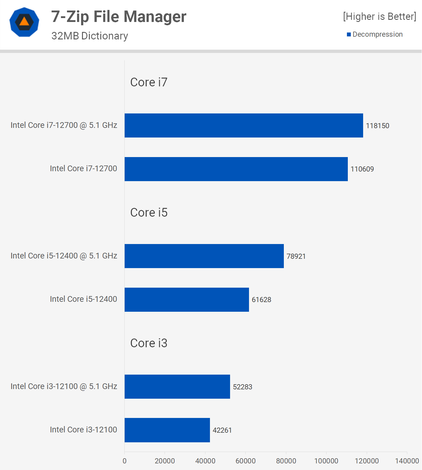The decompression performance is much the same: a 23% uplift for the 12100, 28% for the 12400, and just 7% for the 12700.