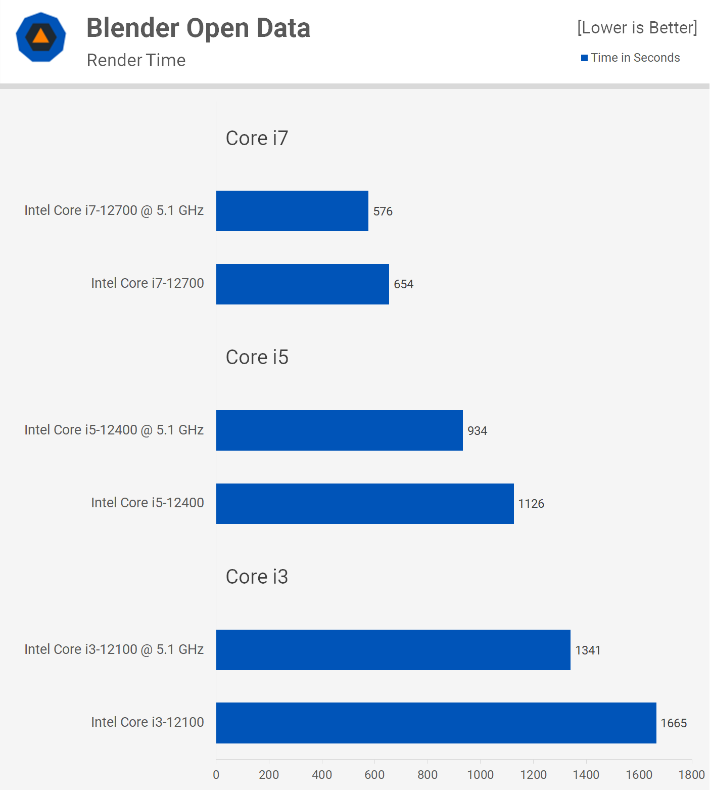 The 12100 overclock reduced the Blender render time by 19%, meaning the overclock was 24% faster. The boost was 21% for the 12400 and 14% faster for the 12700.
