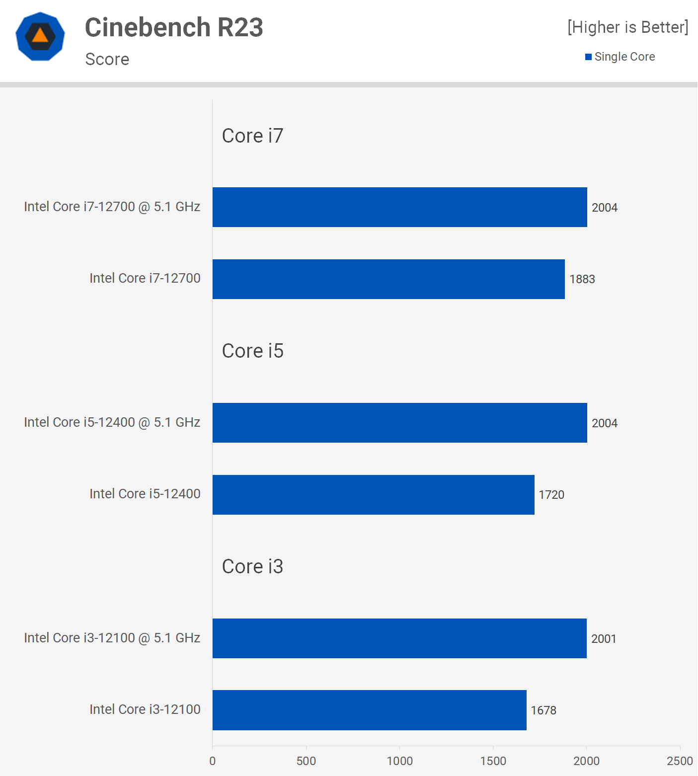 When looking at single core performance, we see a 19% uplift for the 12100, and a 17% boost for the 12400, while the 12700 was improved by just 6%. It's obvious the lower-end models benefit the most from the overclock.