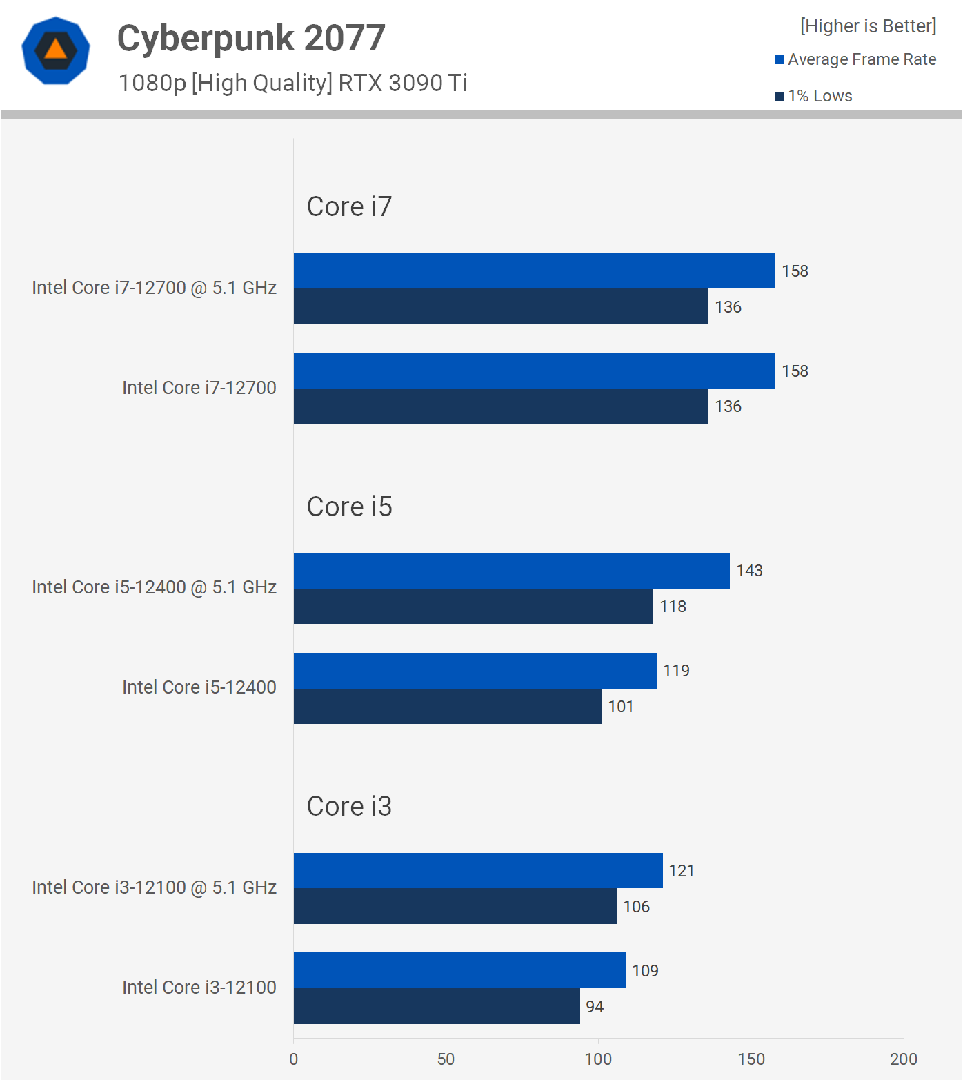 Cyberpunk 2077 performance was more limited with the 12100 and it appears as though clock frequency wasn't the primary bottleneck as the overclock only improved performance by 11%. Meanwhile, the 12400 saw a 20% uplift, though nothing was gained from the overclock with the 12700.