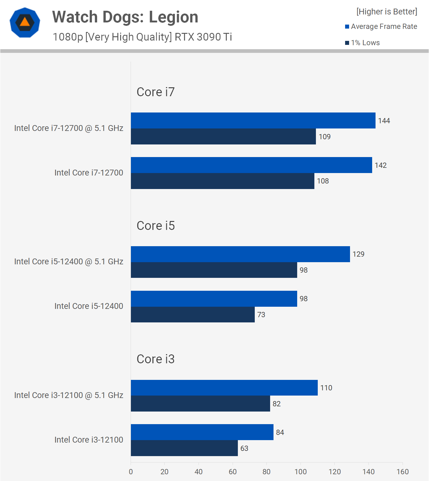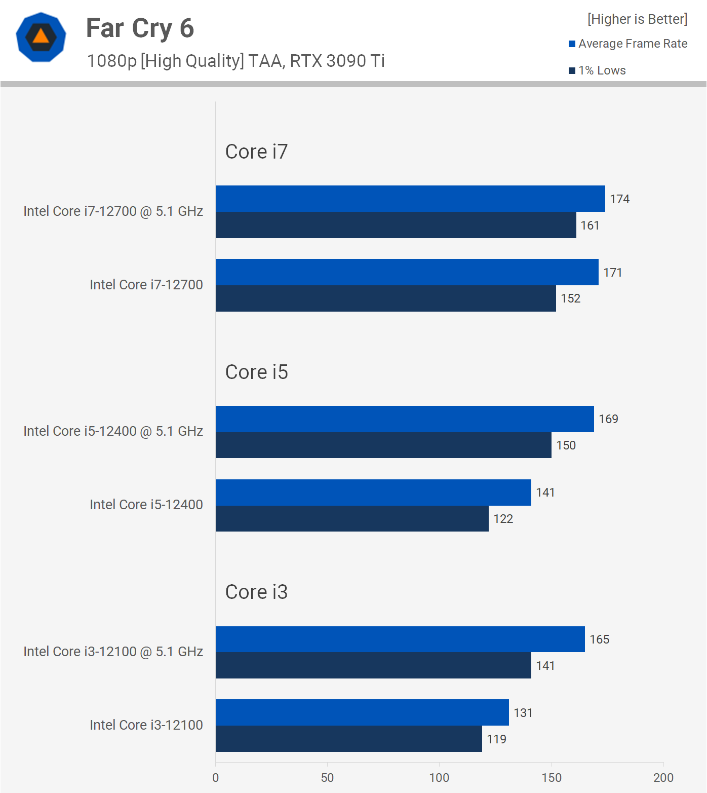 Far Cry 6 is a lightly threaded game that relies heavily on single core performance. This means overclocked the 12100, 12400 and 12700 all delivered very similar performance with just 5% separating the Core i3 and i7 models.