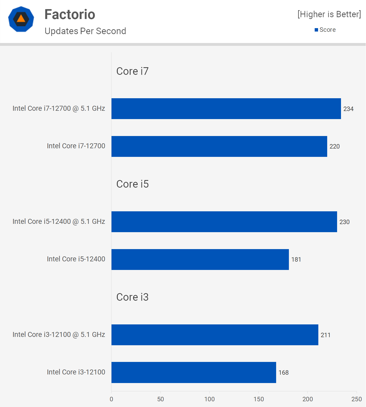 The Factorio benchmark only uses a single core and is heavily influenced by cache performance. The 12100 saw a 26% performance increase, the 12400 a 27% increase, and the 12700 a minor 6% increase. Big performance gains are seen for the Core i3 and i5 models for the most part as those come clocked lower out of the box.