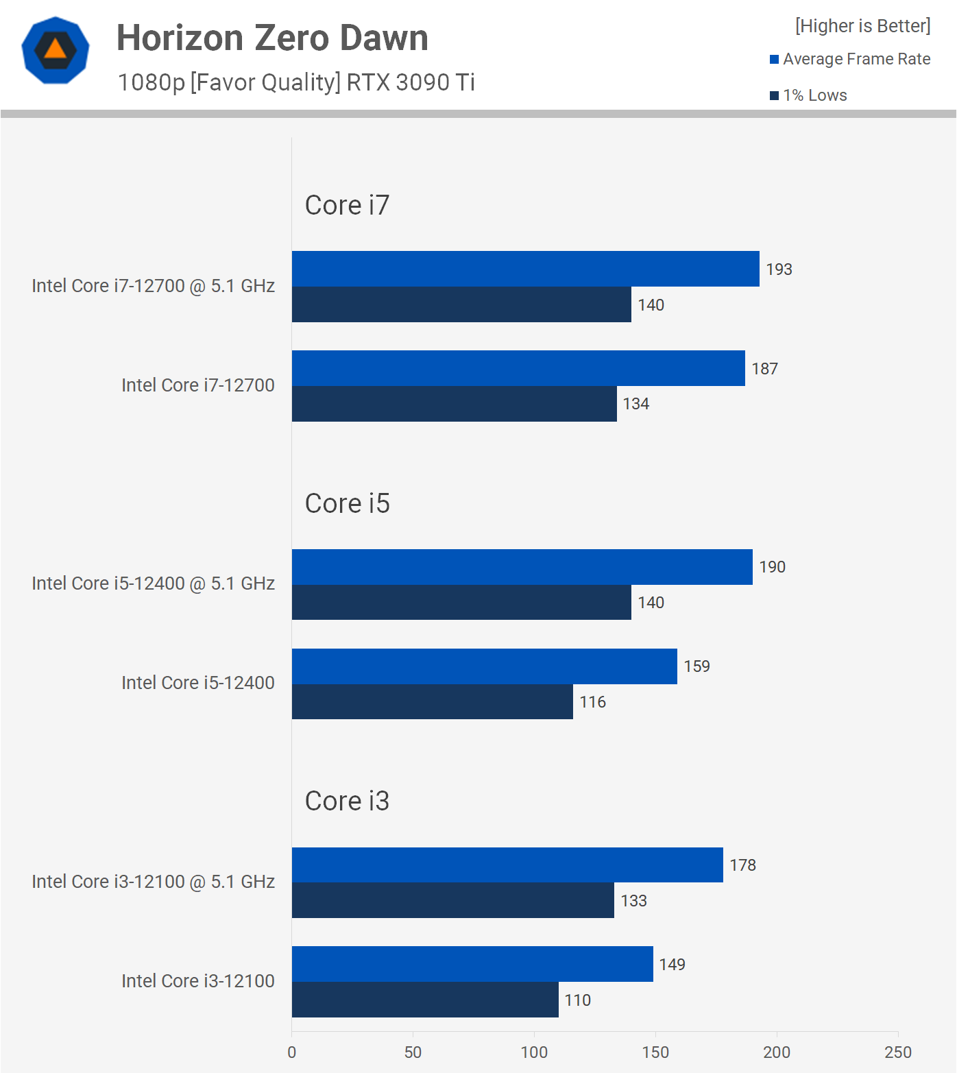 The Core i3-12100 already performed well in Horizon Zero Dawn, but with the overclock frame rates were boosted by a further 19% to 178 fps, which is just 5% slower than the stock 12700. The 12400 also saw a 19% performance increase hitting 190 fps and now we're looking at Core i7-like performance.
