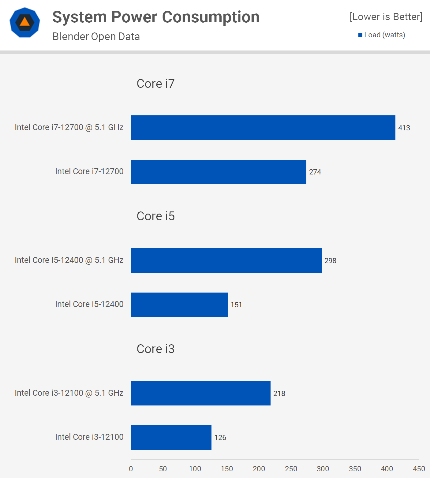 Because we didn't tune the voltages for our overclocks, the power efficiency is terrible, almost doubling from stock figures. Our i5-12400 wasn't stable with 1.29v, and this still saw total system consumption hit 266W, or just an 11% reduction compared to what's shown here at 1.39v, which is why we didn't bother fine-tuning voltages for this testing.