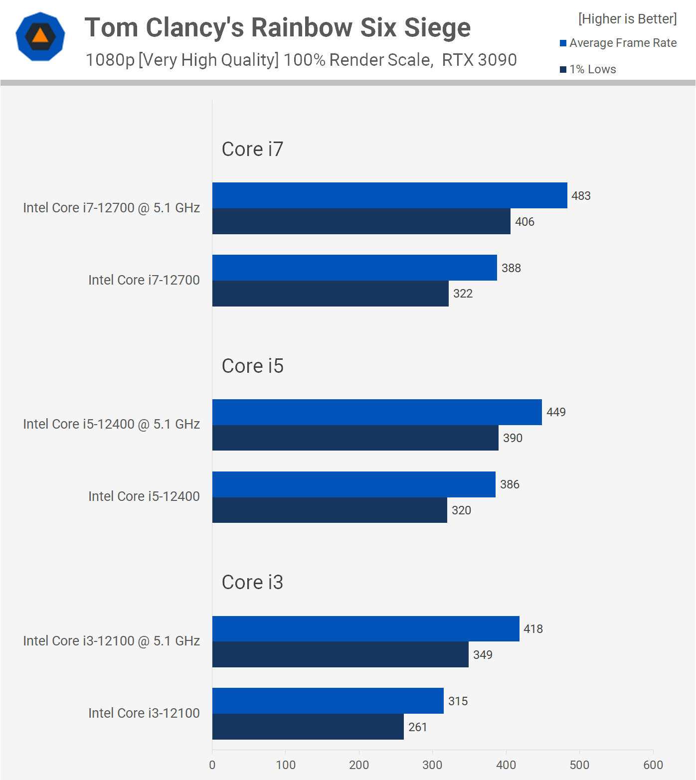 Last up we have Rainbow Six Siege and all three CPUs had no issue with this older title. Still, if you are after more frames our 12100 overclock boosted performance by 33% and the 12400 overclock resulted in a 16% improvement.