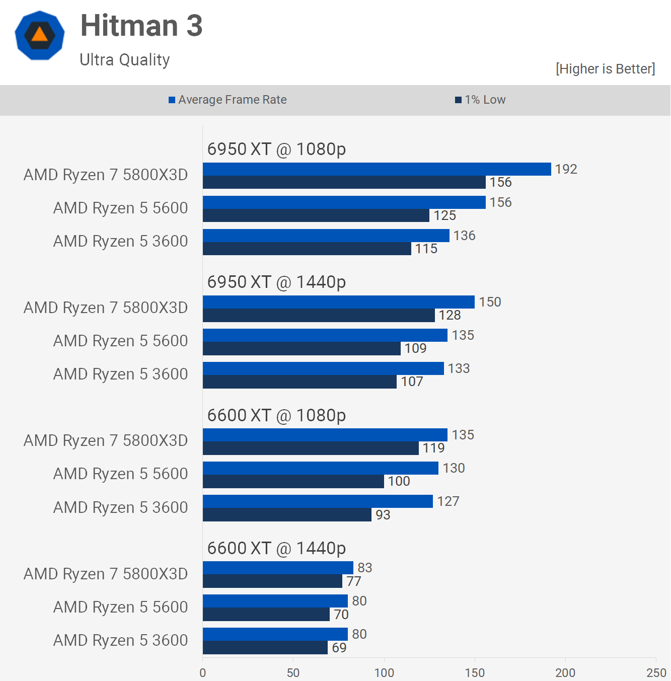 Moving on to Hitman 3, this is another game that doesn't needs hundreds of frames per second, but if you're wanting to get as many fps as possible you'll appreciate the 5800X3D as it was 41% faster than the 3600, seen when comparing the average frame rate.