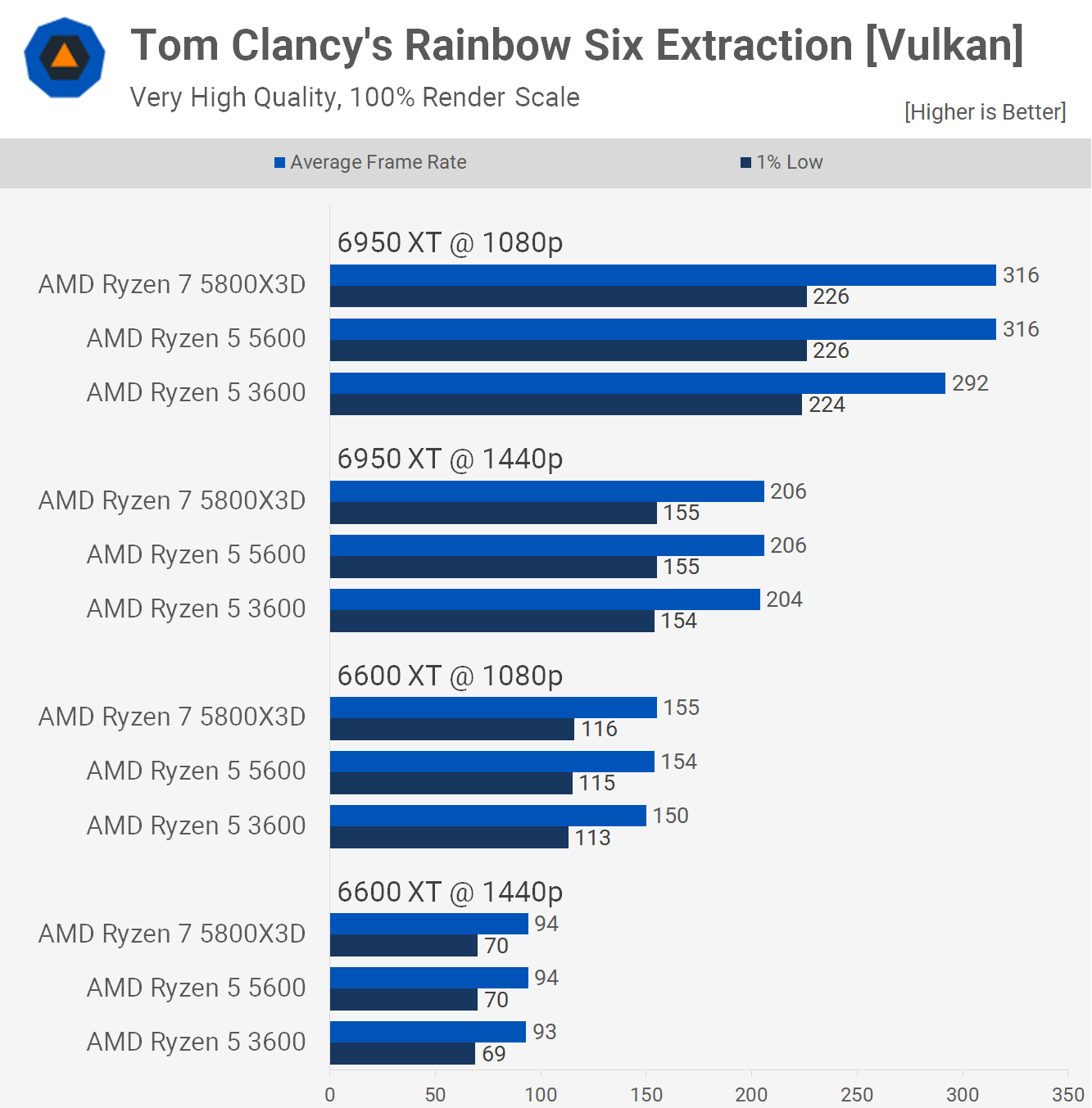 Rainbow Six Extraction can play at hundreds of frames per second even with the Ryzen 5 3600, so the 5800X3D has little to offer in exchange. We're almost always GPU limited and those limits are found at extremely high frame rates, so any of these CPUs should work well for this title.