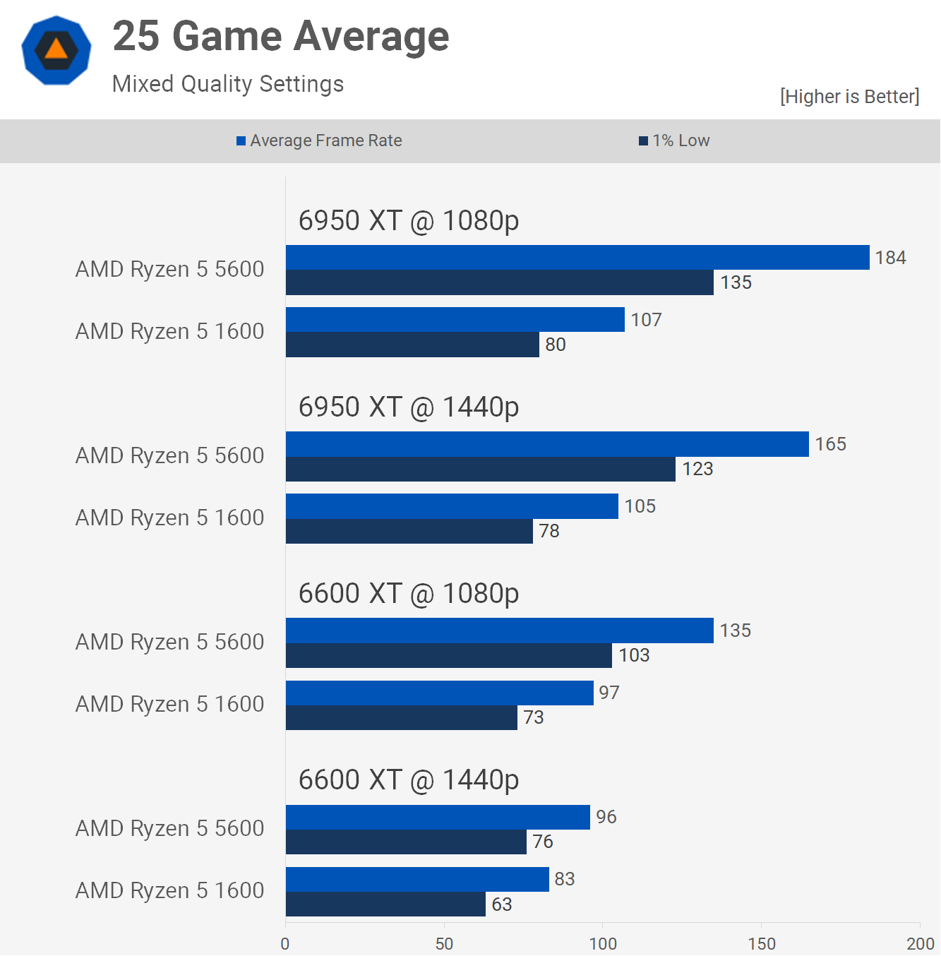 But if you want that high refresh rate experience an upgrade will be required. We maxed out the 6950 XT at 1440p with the 5600, delivering a 50% performance jump and then 73% at 1080p.