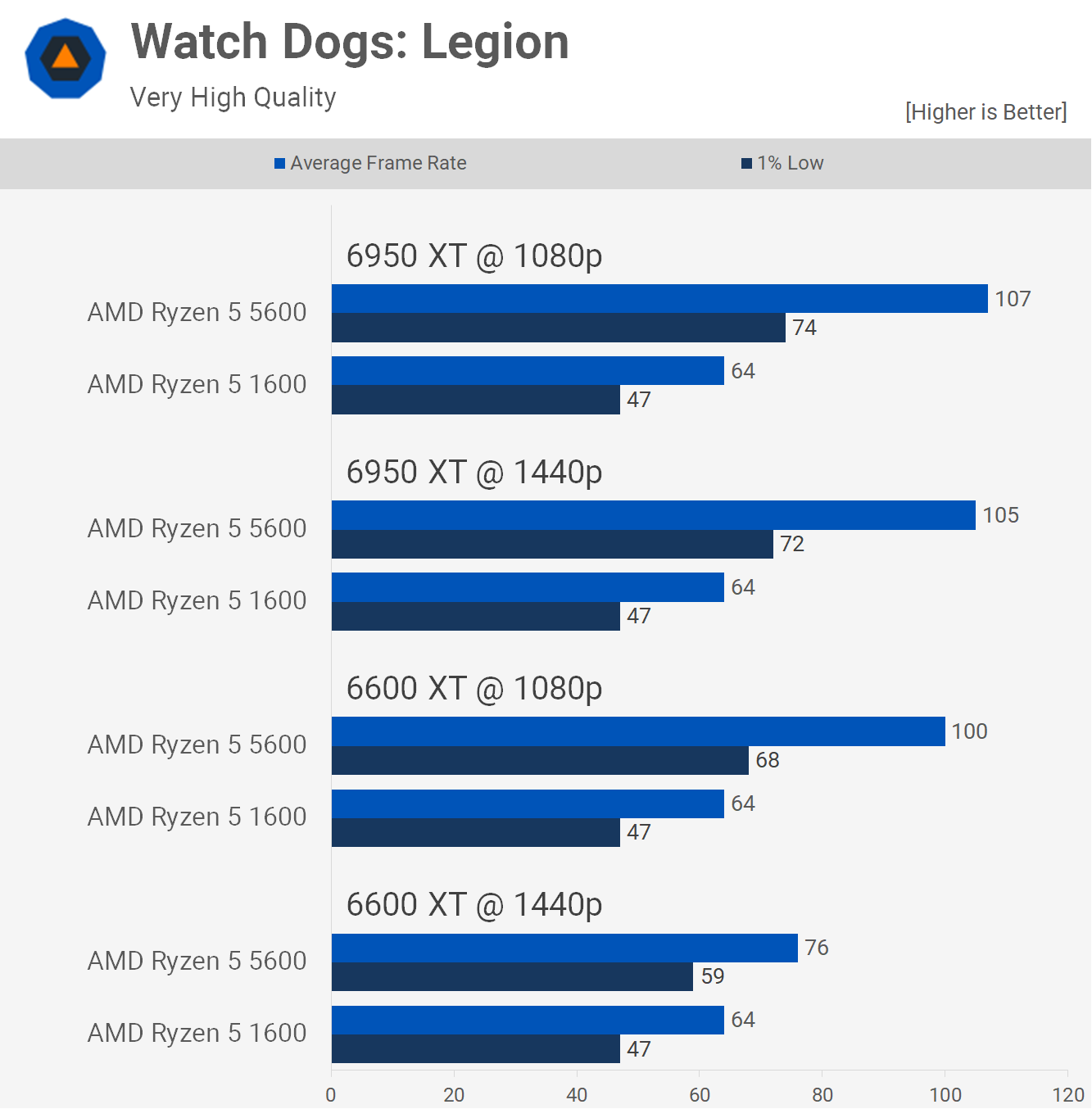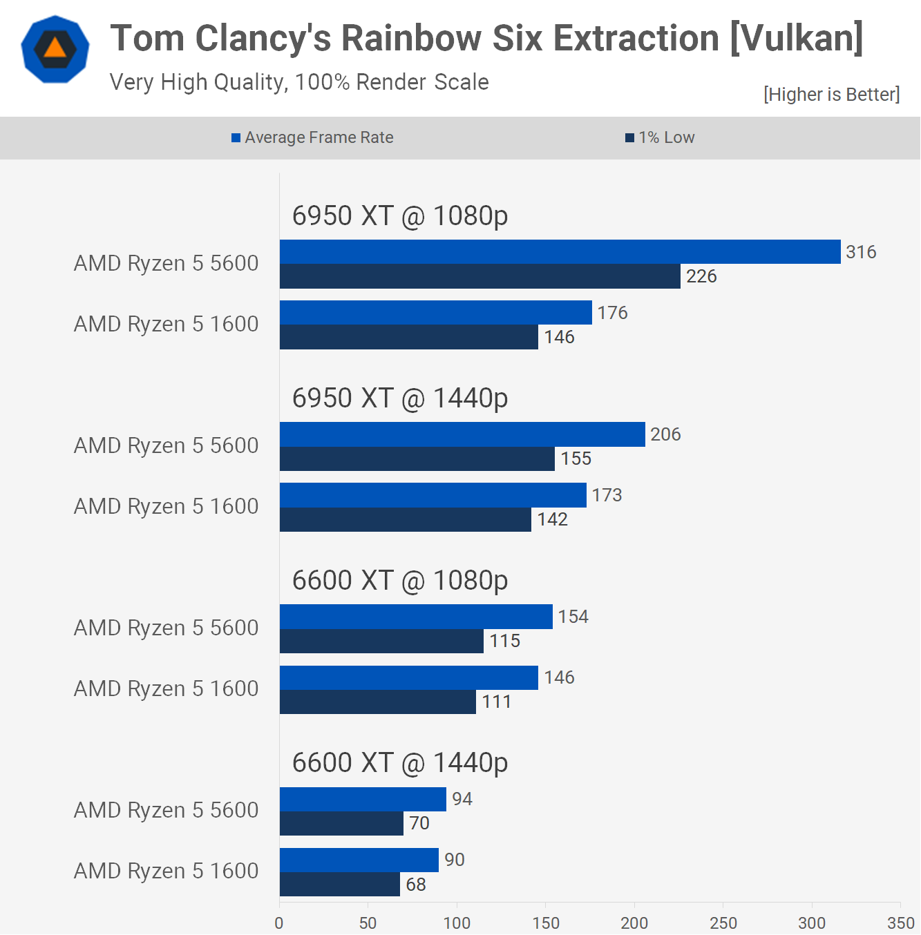 There is some separation with the 6950 XT, though at 1440p the 5600 was just 14% faster and it wasn't until we dropped the resolution to 1080p that the margin opened up quite significantly to a 32% advantage in favor of the newer Zen 3 processor. The Ryzen 5 1600 was very playable, so the CPU upgrade didn't see a big change in this title.