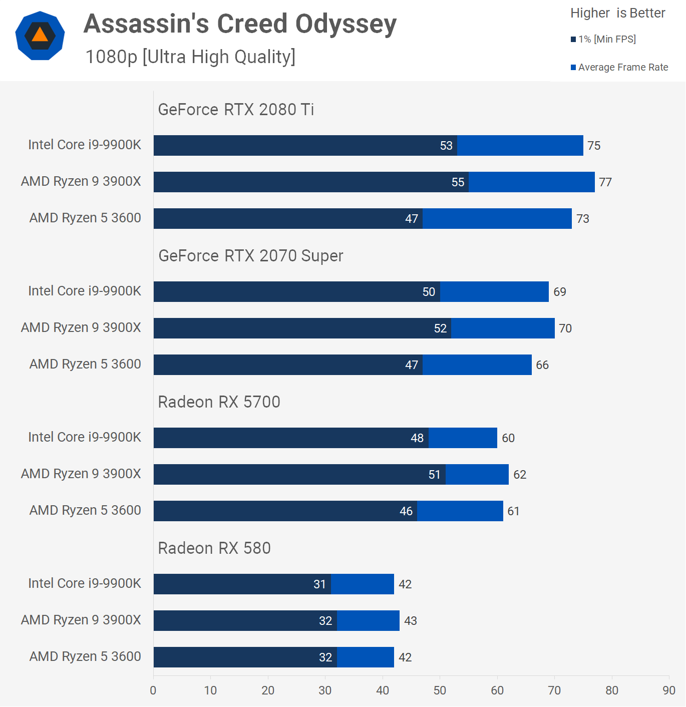 Then at 1440p the 9900K was up to 18% faster with the 2080 Ti, 14% faster with the 2070 Super, 10% faster with the RX 5700 and no faster with the RX 580. Remember this is a worst case scenario for Ryzen which is one of the reasons we wanted to include this game as part of the test suite.
