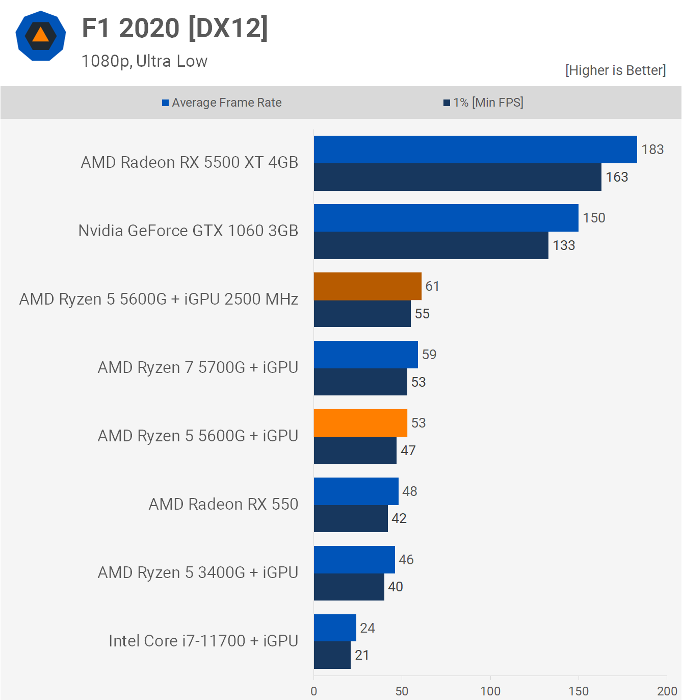 F1 2020 also plays reasonably well with the 5600G, spitting out 53 fps on average when stock and that made it slightly faster than the RX 550. Our overclock boosted performance by 15%, allowing for 61 fps on average, and at this point the gaming experience is excellent for an iGPU.