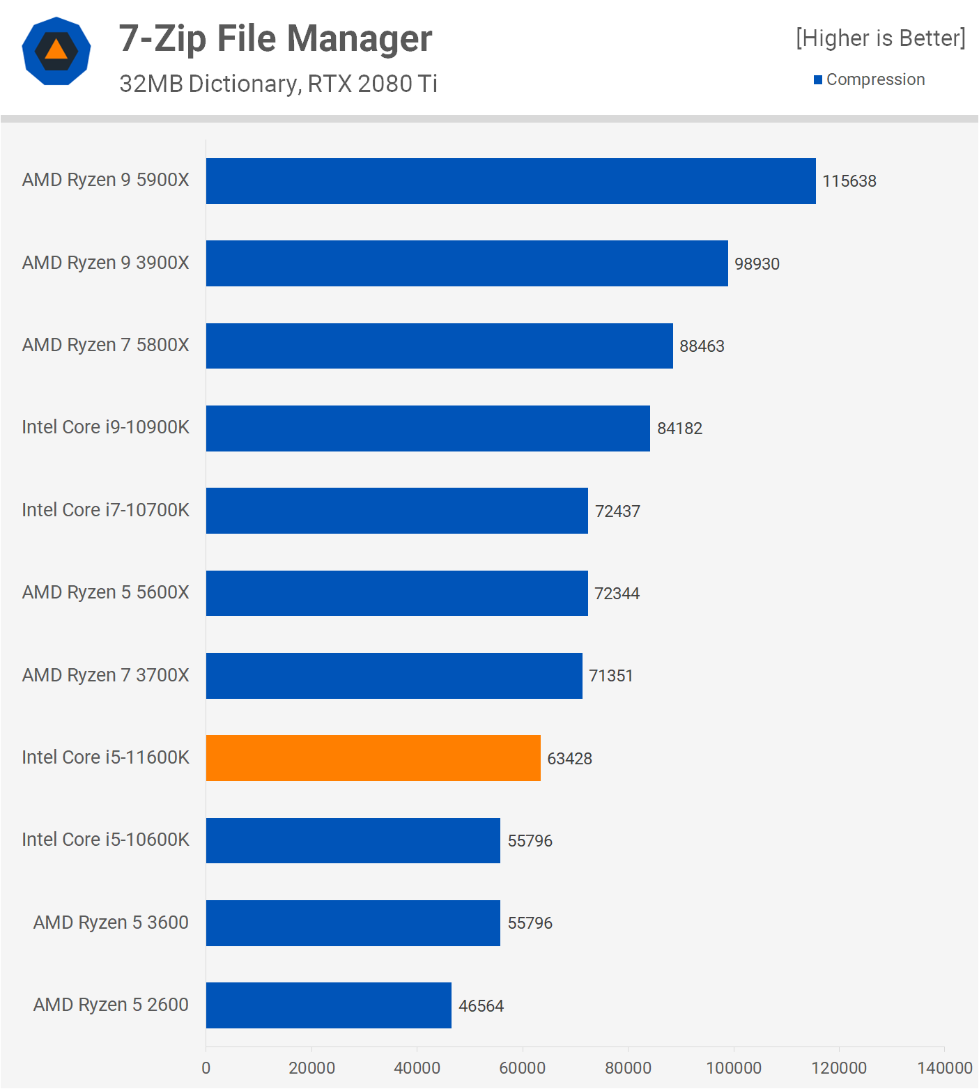 The gains in the 7zip compression benchmark aren't as impressive, though we're still looking at a solid 14% uplift over the 10600K. For Intel that meant the new 11600K trailed the 5600X by a 12% margin in this test.