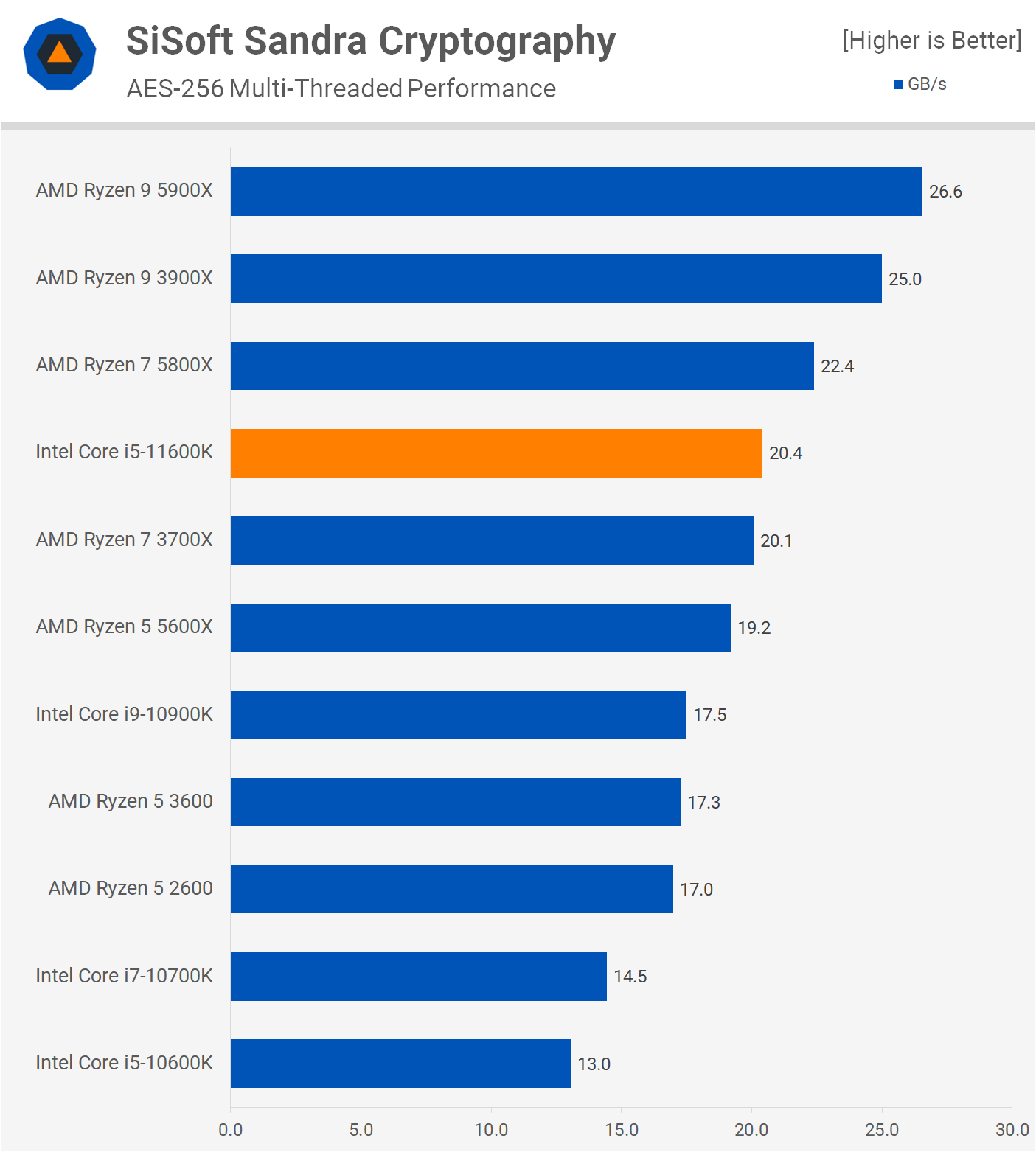 Intel's 10th gen Core series was particularly weak for AES-256 encryption, but here we're looking at a huge 57% performance uplift for the 11600K, placing it 6% ahead of the 5600X. An incredible performance uplift and this is the first benchmark we've seen where Intel now beats AMD.