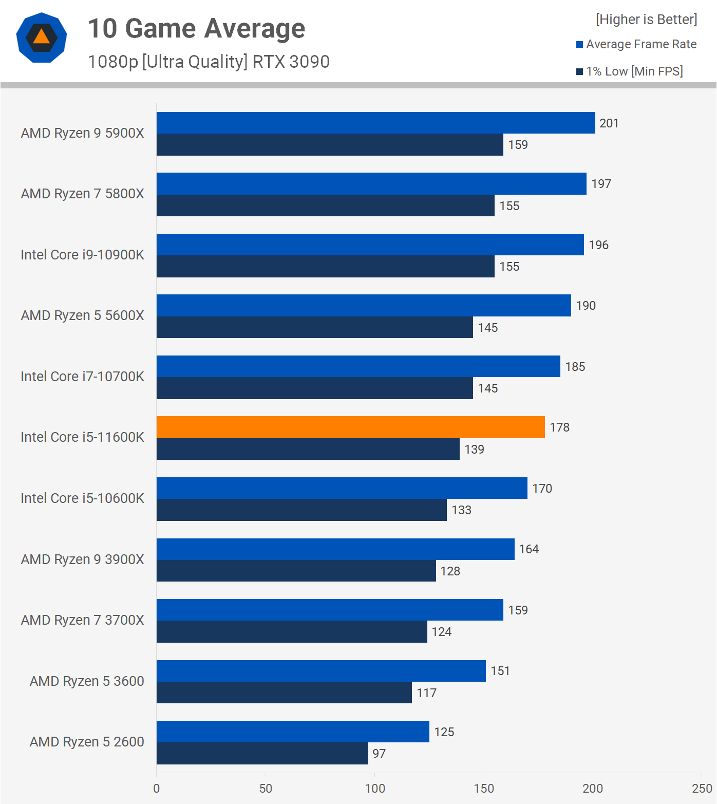 The new 11th-gen Core i5 CPU still pushed over 240 fps on average, so the margins probably don't matter, but it wasn't nice to see the 11600K trailing the 5600X, something we didn't see much of in the productivity benchmarks.