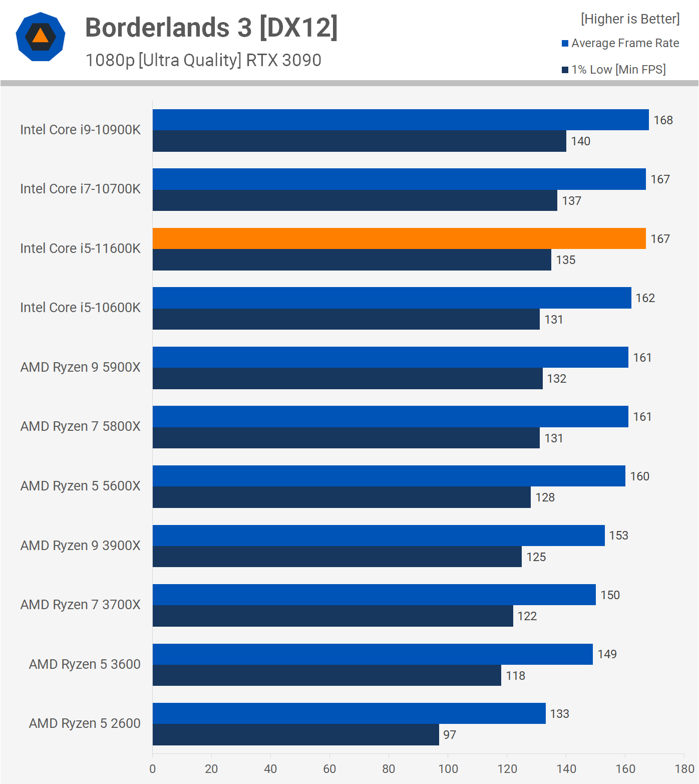 Intel was already slightly ahead of AMD in Borderlands 3 and the 11600K manages to extend that margin, boosting performance over the 5600X by 4%. Not exactly earth-shattering but it was good to see Intel making some gains here.