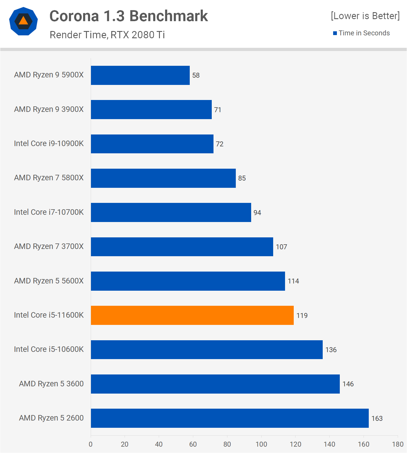 We're looking at a 14% performance uplift in the Corona benchmark and that was enough to get within 5% of the 5600X, here the AMD processor was 4% faster which is a fairly insignificant margin.