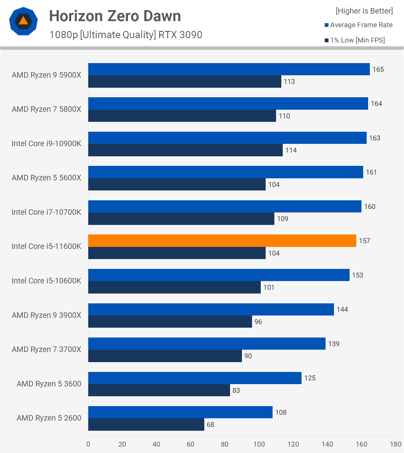 Next up we have Horizon Zero Dawn and here we are looking at comparable performance with the Ryzen 5 5600X. The 1% low performance is identical while the AMD CPU was just 3% faster on average. The 11600K is also 3% faster than the 10600K, meaning the three CPUs deliver similar performance in this title.