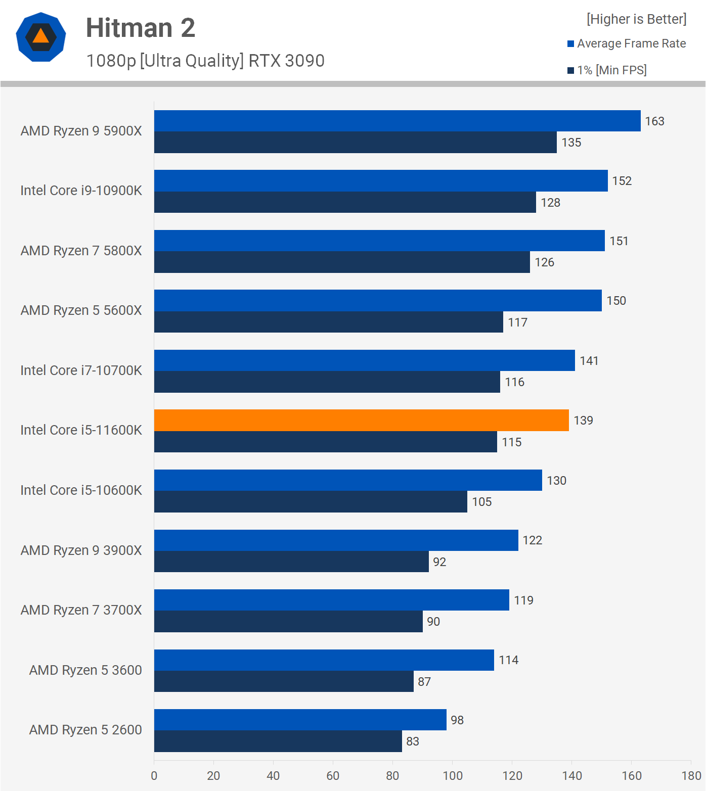 We're looking at a 7% performance boost for the 11600K over the 10600K in Hitman 2, or 10% if we compare the 1% low performance. That's a decent boost but it wasn't enough to catch the 5600X which still leads by an 8% margin.