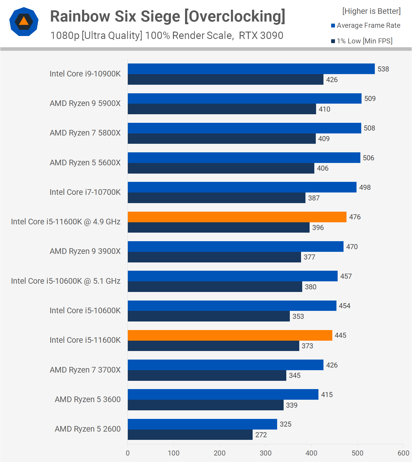 The Rainbow Six Siege results are also interesting. The 11600K saw a 7% boost once overclocked, while the 10600K saw less than a percent. Now you might think that's not possible and I'll admit it certainly doesn't look right, but these results are based on a three-run average and we did triple-check.
