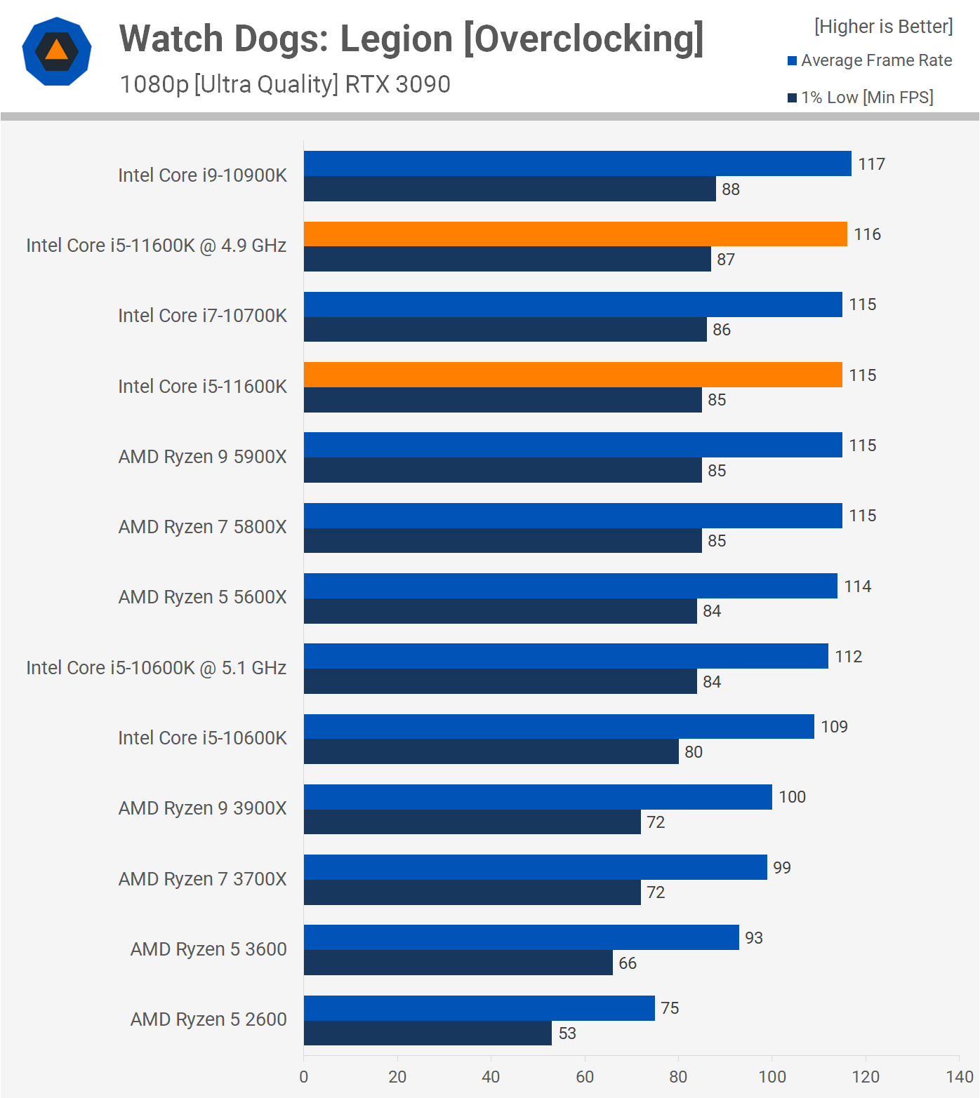 Lastly, here's a look at overclocking performance with Watch Dogs Legion, like what we saw with Cinebench R20, there's little to be gained by overclocking the 11600K. We're also only looking at a 3% overclock for the 10600K.