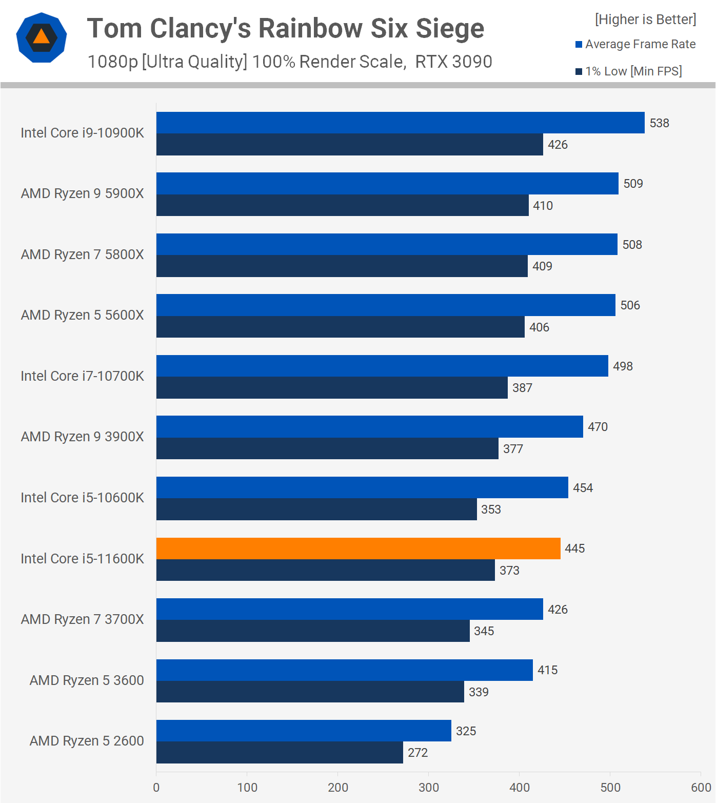 The Rainbow Six Siege results are a bit mixed, the 11600K does improve 1% low performance by 6%, but then we saw a 2% reduction for the average frame rate. The end result saw the 5600X deliver 14% greater performance, hitting no less than 506 fps.