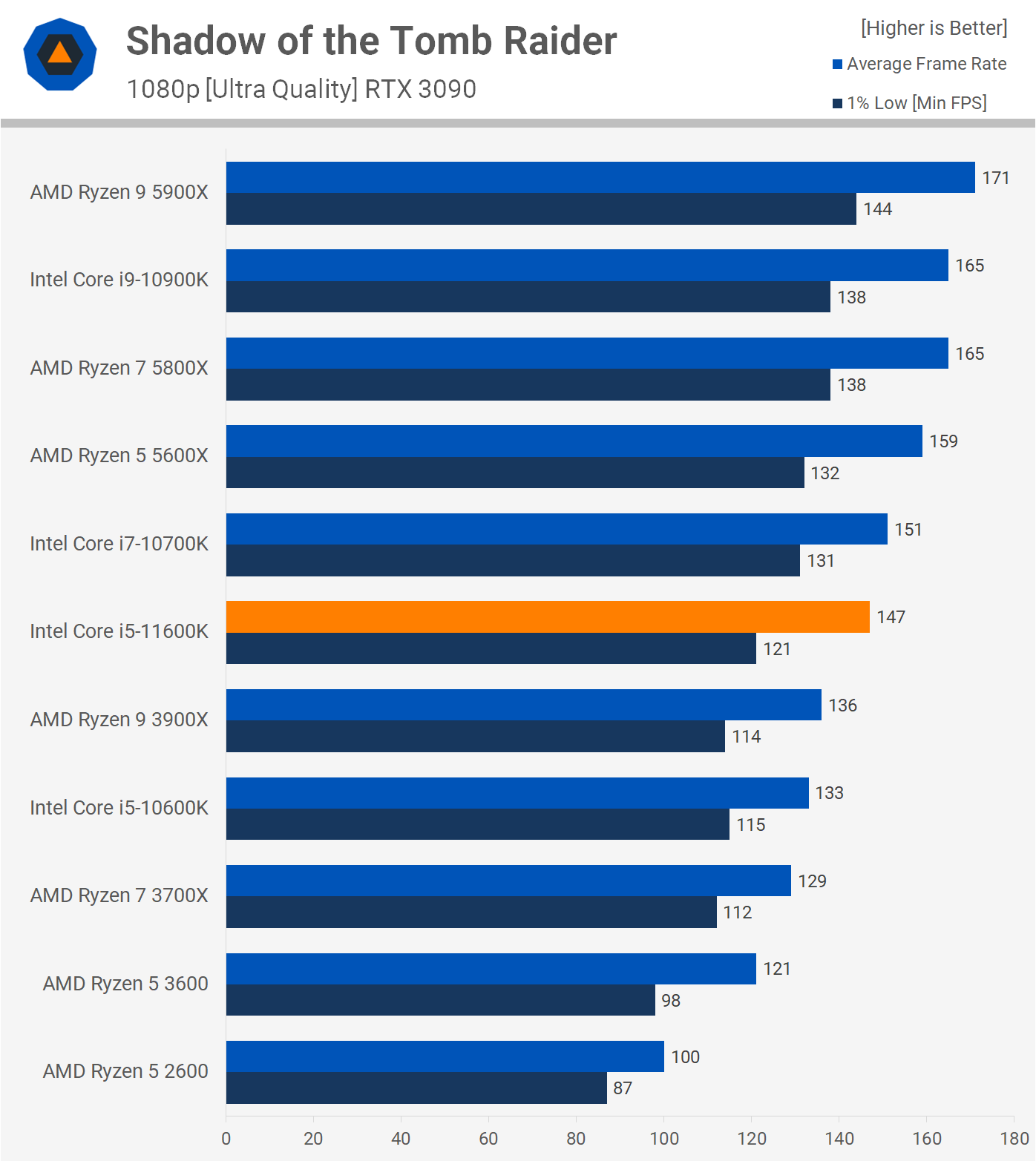 The village we use for testing in Shadow of the Tomb Raider is very CPU demanding and here the 11600K does deliver a strong 11% performance uplift over the 10600K, which is great to see. It's still not the fastest 6-core processor in this game as the 5600X was a further 8% faster hitting 159 fps on average.