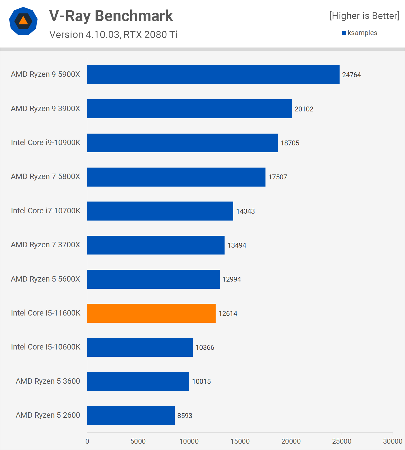Rendering performance in V-Ray has also been greatly improved as the 11600K offered 22% greater performance than the 10600K, again getting it within range of the 5600X.