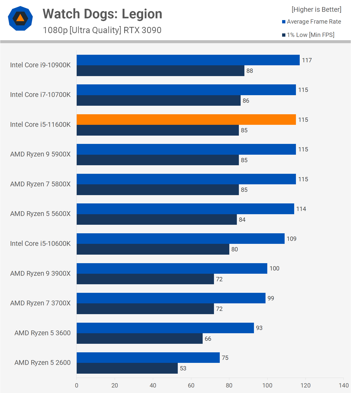 Moving on to gaming benchmarks, here we've swapped out the RTX 2080 Ti for the more powerful RTX 3090. Starting with Watch Dogs Legion we're looking at a mild 6% performance uplift over the 10600K, which places the 11600K on par with the 5600X.