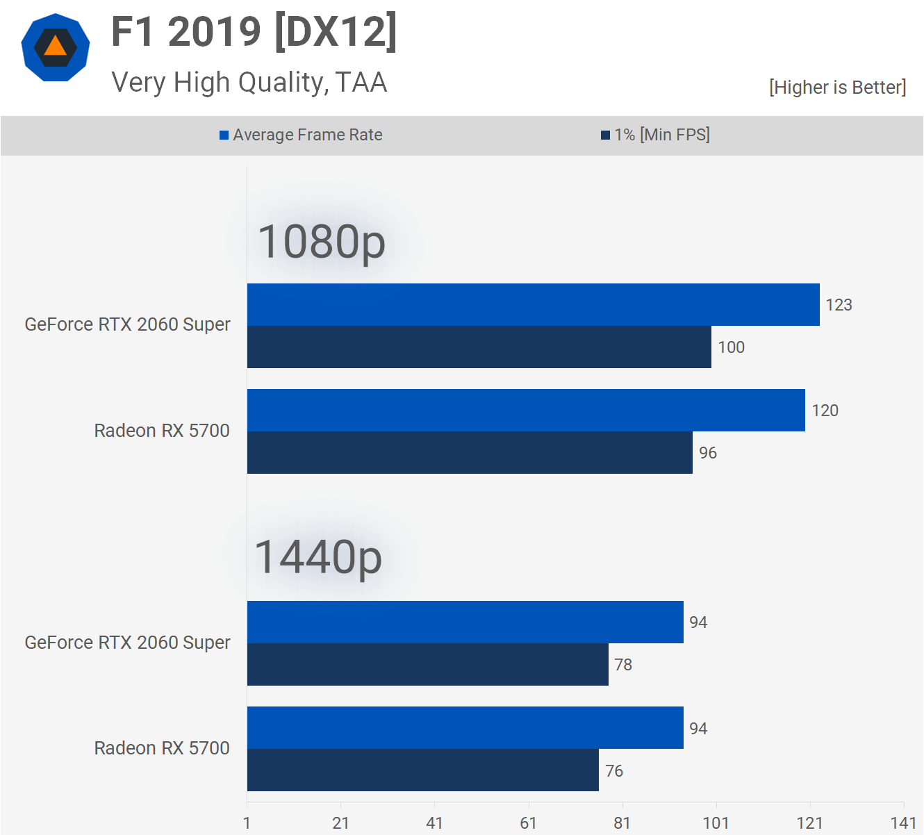 F1 2019 provides very competitive results, the 2060 Super was a few frames faster at 1080p while we see basically identical performance at 1440p. Both GPUs maintained well over 60 fps at 1440p.