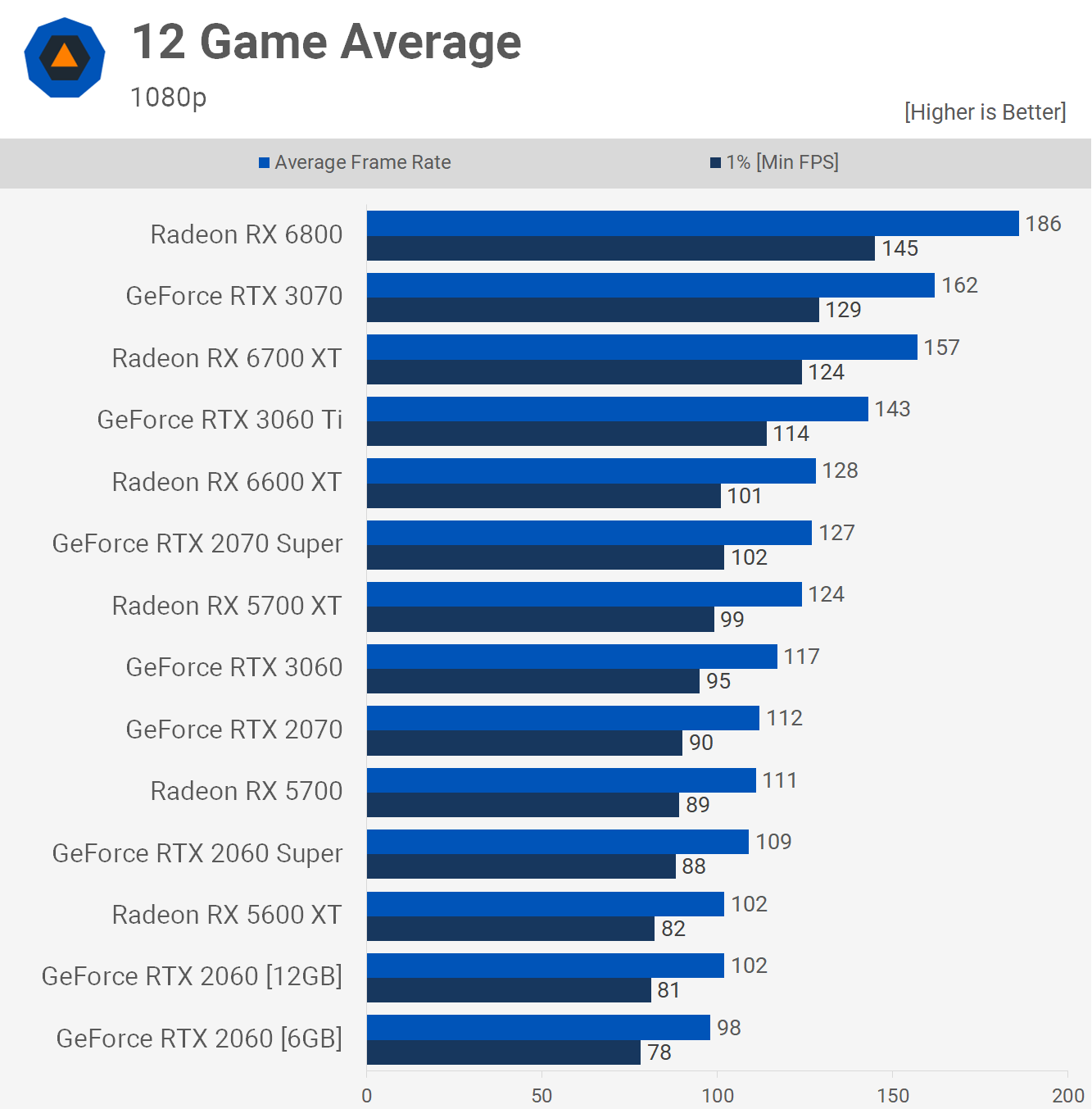 Starting with the 1080p results we see that on average across the 12 games tested, the 2060 12GB was ~4% faster than the original 6GB model, which is nothing to write home about. This also made it the second slowest GPU in our test, or technically it was tied with the 5600 XT, another slow GPU by today's standards, but certainly good enough for 1080p gaming.